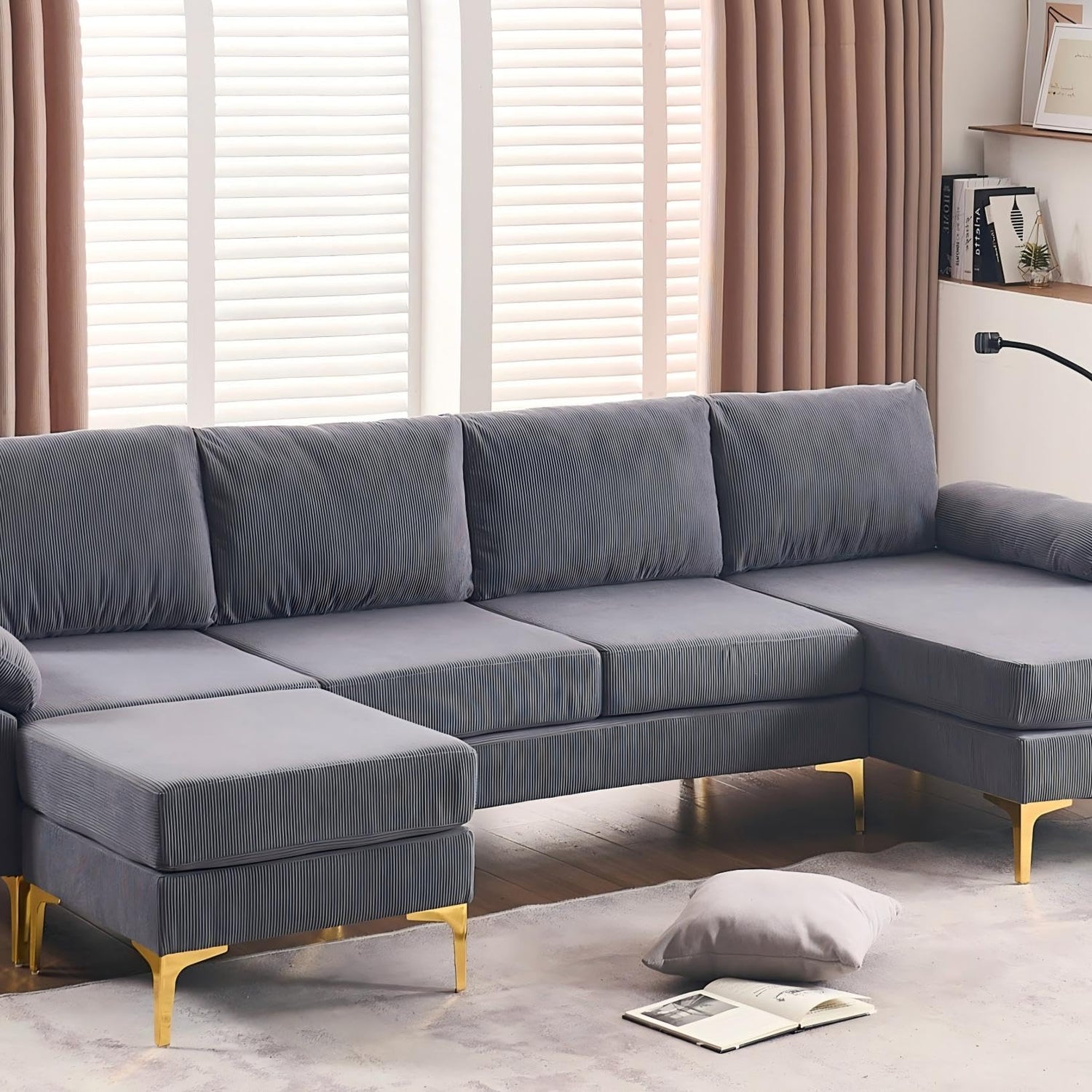 UPHYB 114” U-Shaped Sectional Sofa Couch,Corduroy Convertible 4 Seater Sofa Set with Chaise Lounge,Ottoman and Detachable Phone Holder,Comfy L Couch for Living Room,Bed Room and Apartment(Grey)