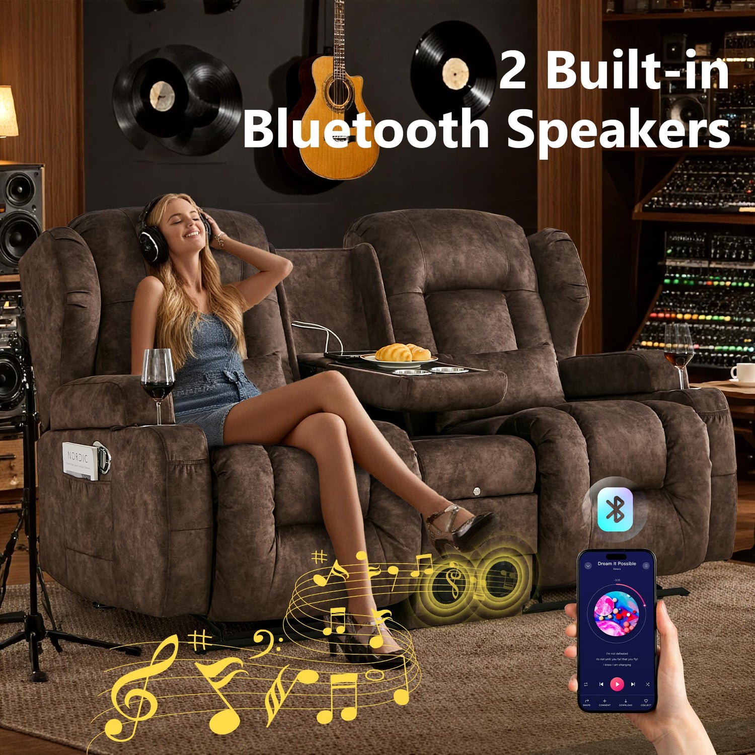 URRED Loveseat Rocker Recliner Sofa with Console, Manual Reclining Loveseat RV Couch Double Rocking Chair Nursery with Cup Holders, Side Pocket, Bluetooth Speaker, USB, Outlets (Brown)