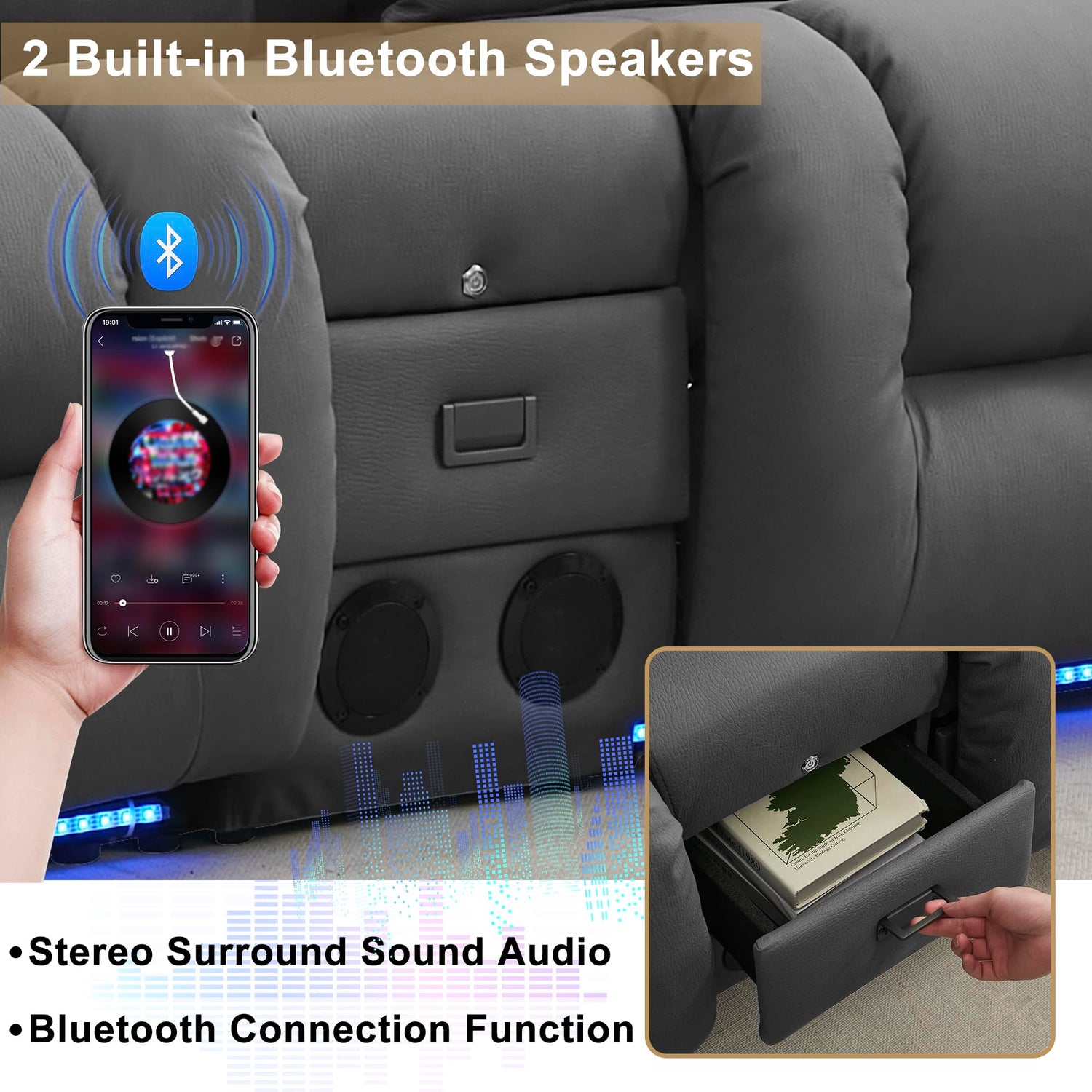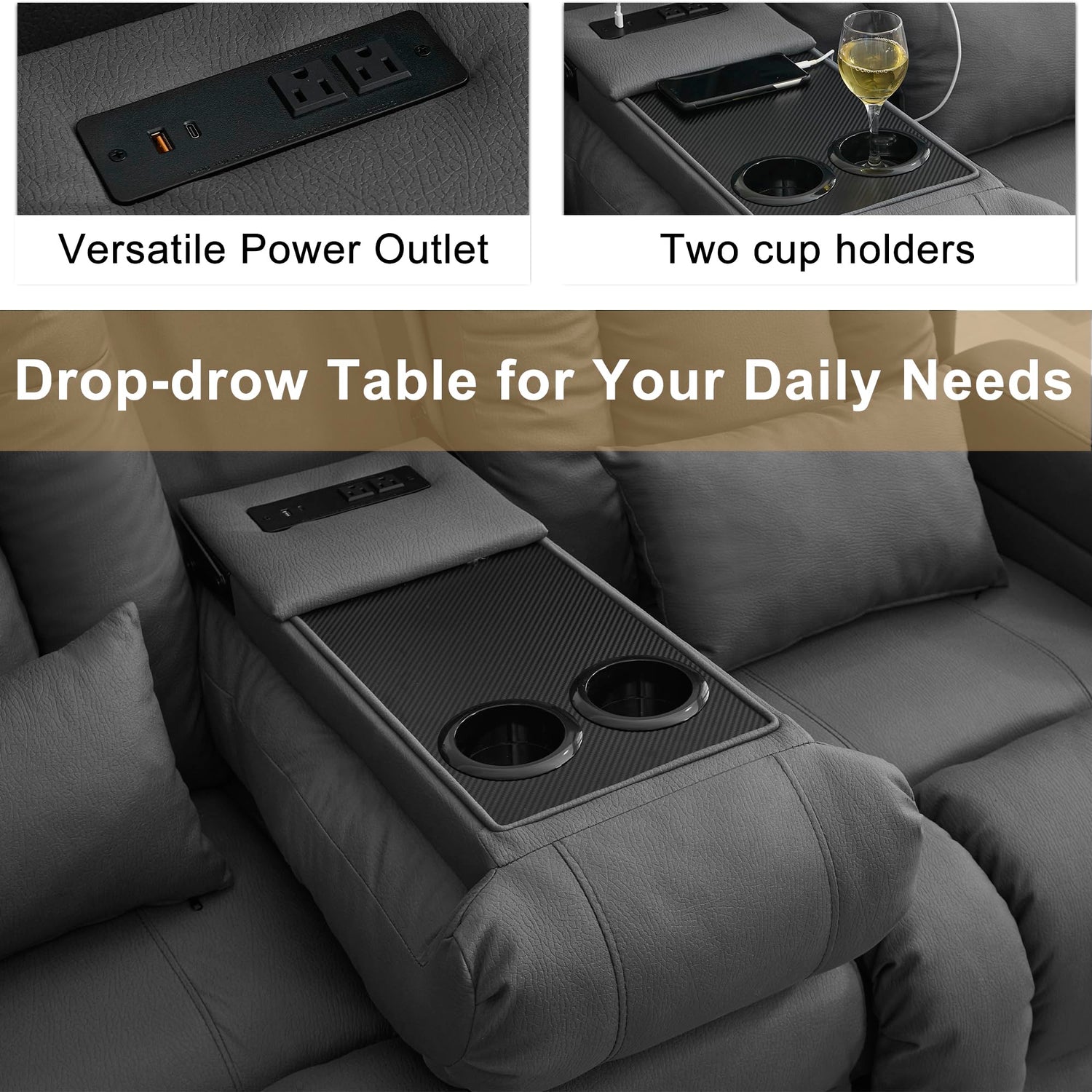 - Flipped Backrest Console:An extra small seat is added to the loveseat recliner, while the backrest can be flipped to serve as a center console when the seat is not needed. The center console is equipped with an outlet, USB port, Type-C port, two cup holders, a storage drawer, Bluetooth Speakers and a small tabletop.