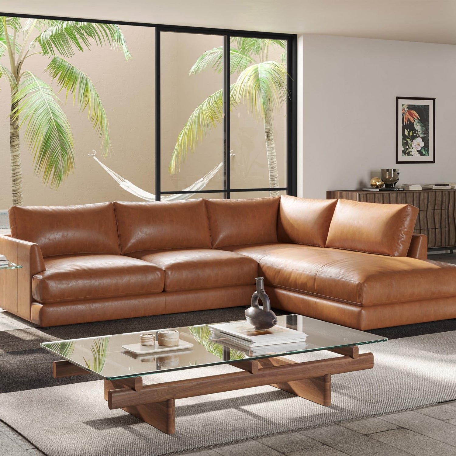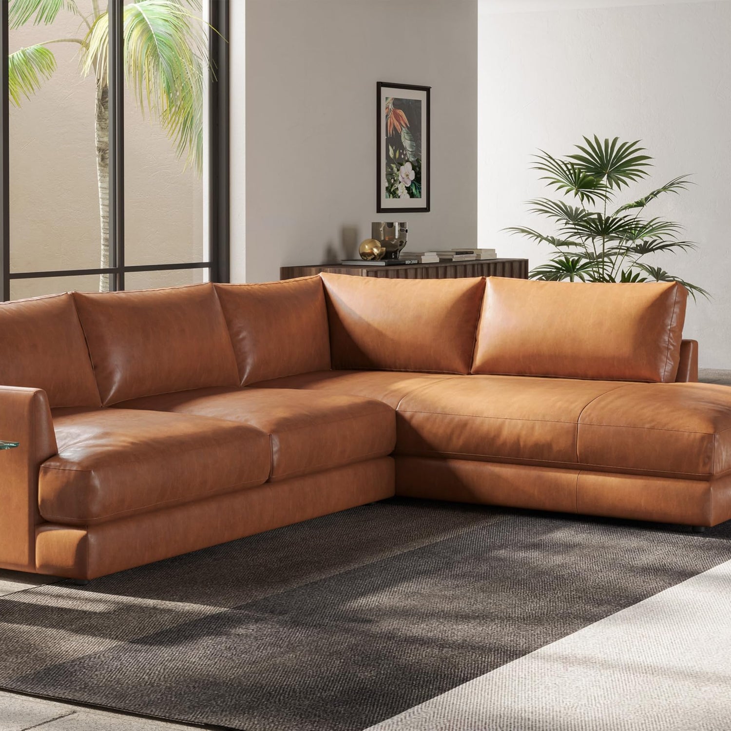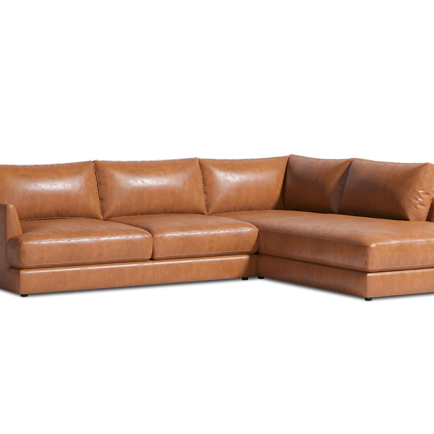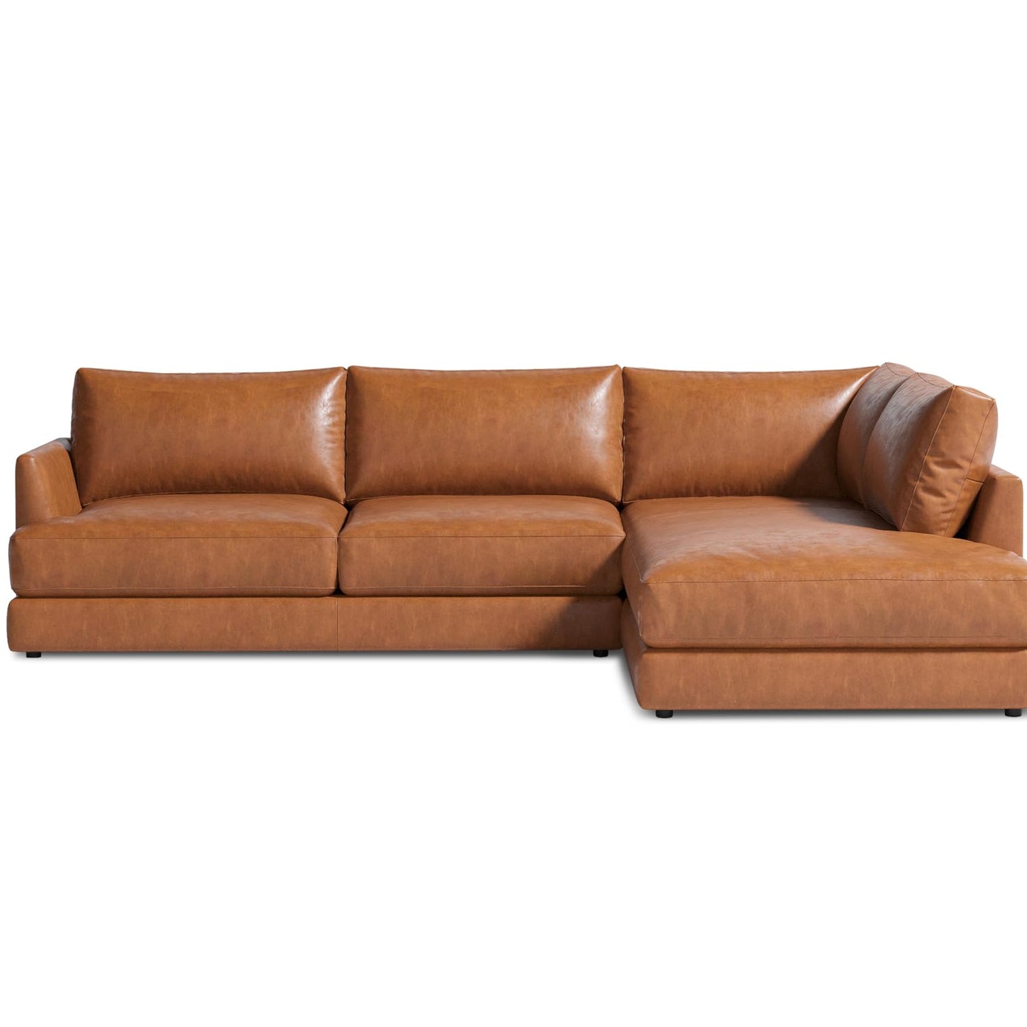 Valencia Serena 108" Cognac Tan Brown Full Leather Sectional Sofa with Right Chaise | Nappa 11000 Leather, Modern Low Profile Lounge Sofa | L Shaped Couch for Living Room Furniture