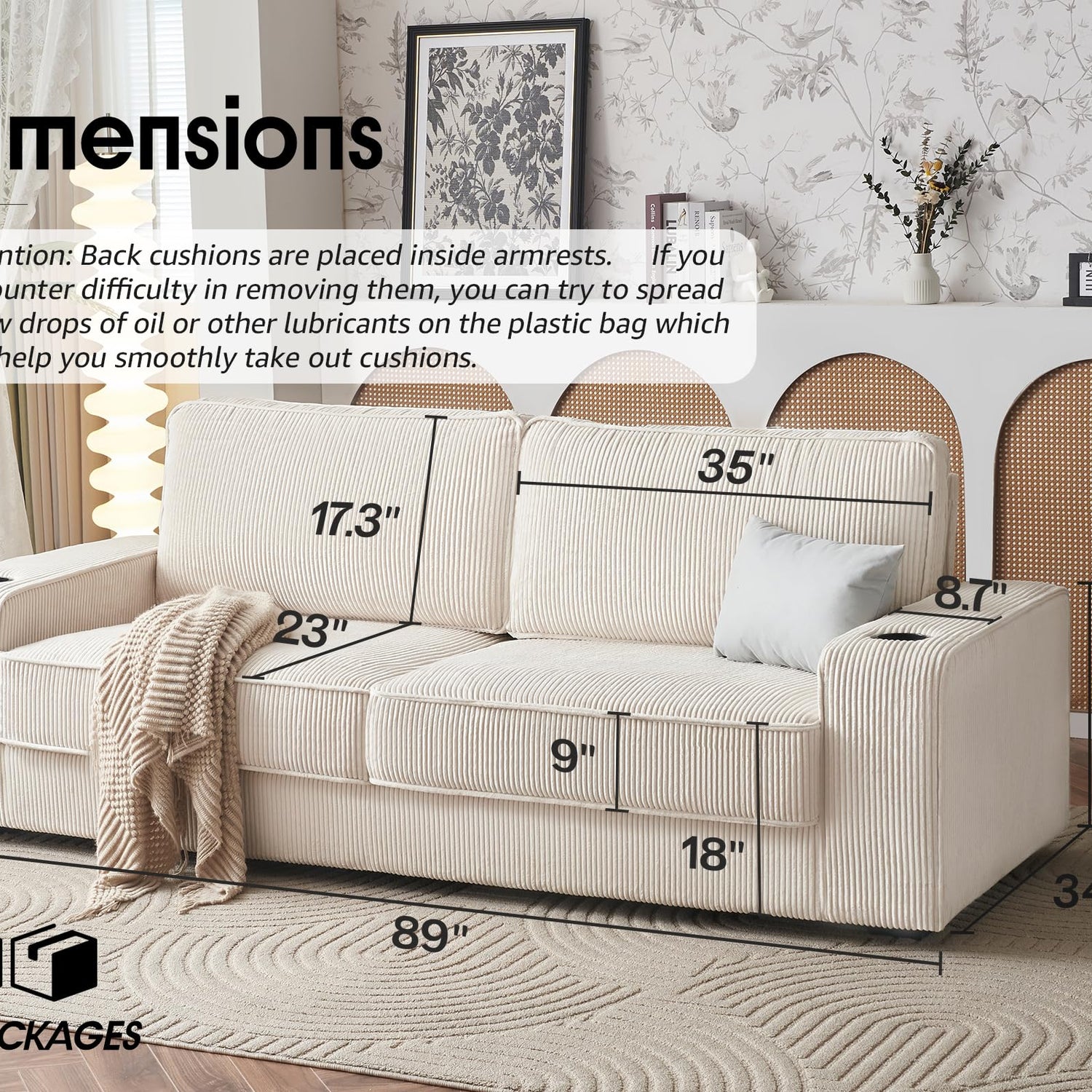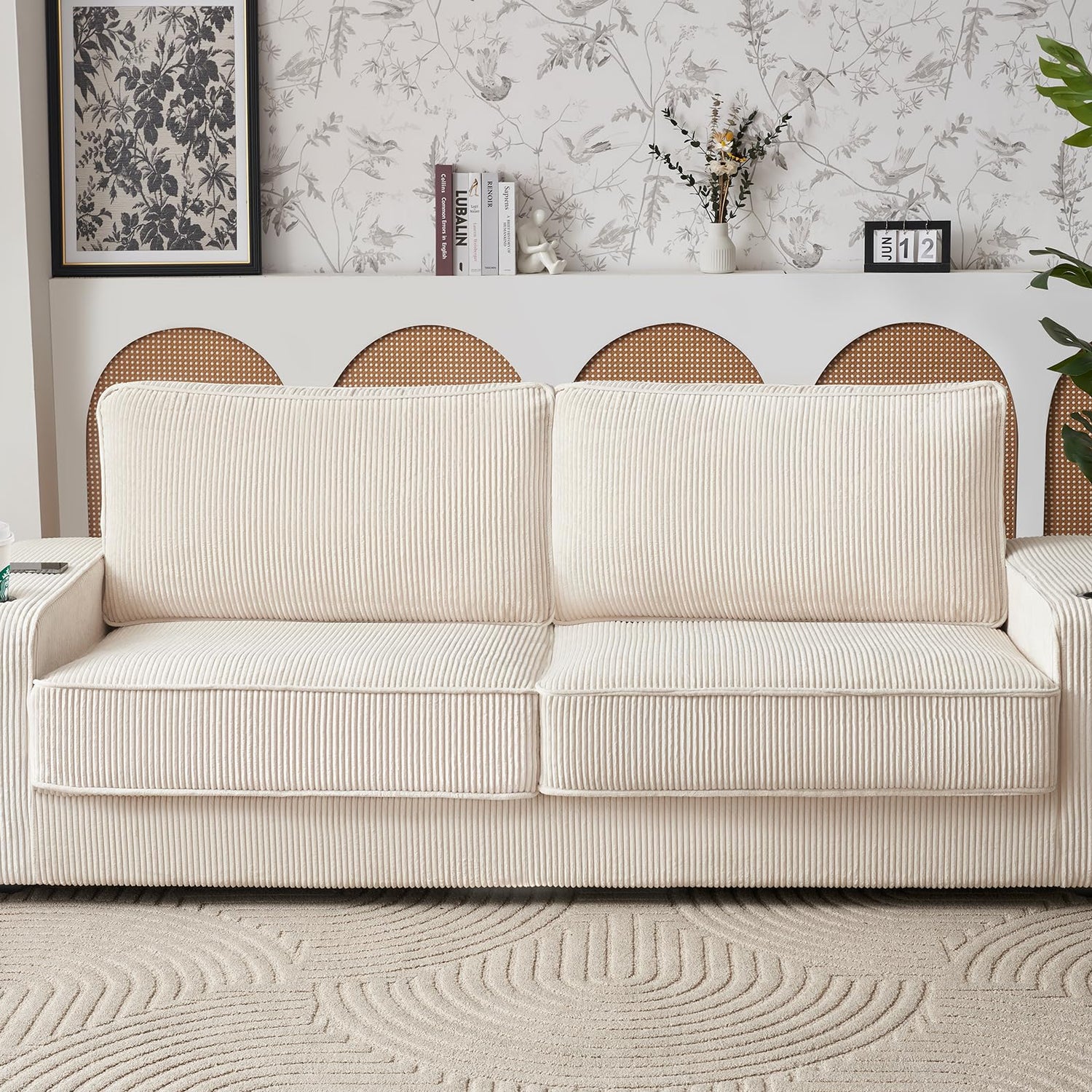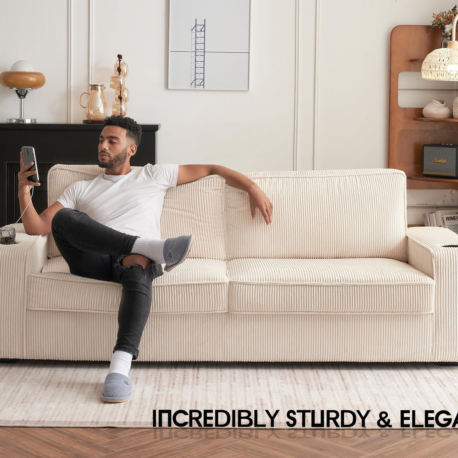 VanAcc Sofa, 89 inch Modern Sofa with USB Charging Ports & Cup Holders, Deep Seat Sofa Couch- Comfy Couch for Living Room (Beige Corduroy)