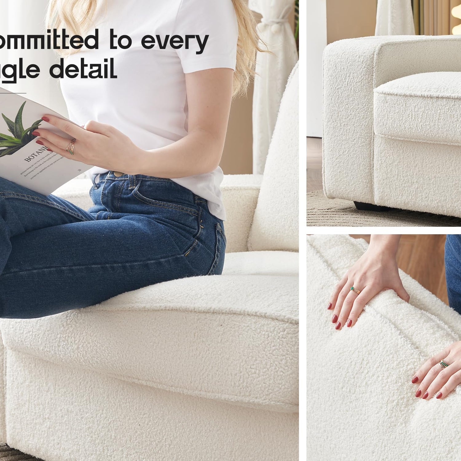 - Breathable Bouclé Fabric- Deep seat sofa is upholstered with bouclé fabric, offers a luxuriously soft and plush texture, inviting relaxation and comfort. Cushions and legs are stored inside armrests.