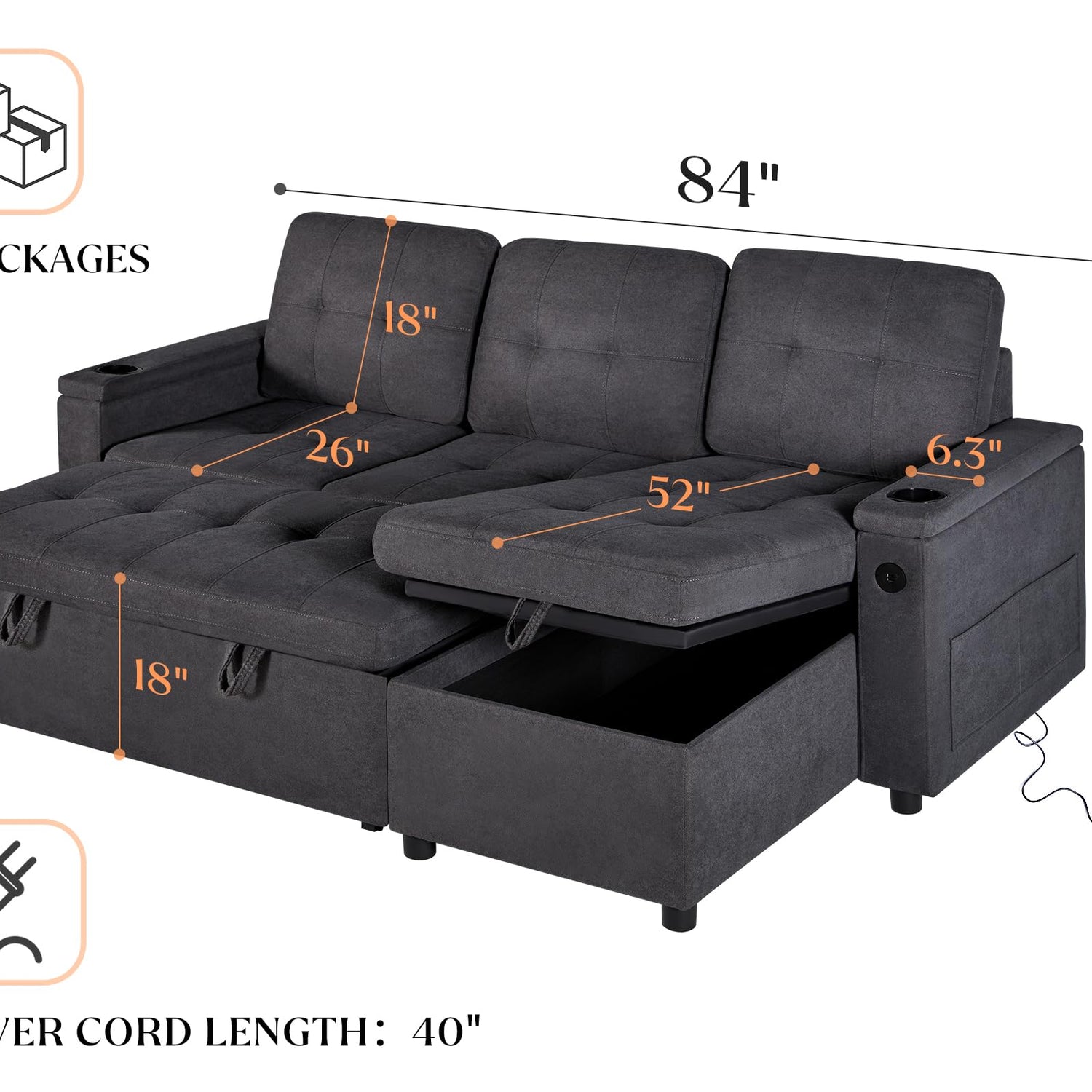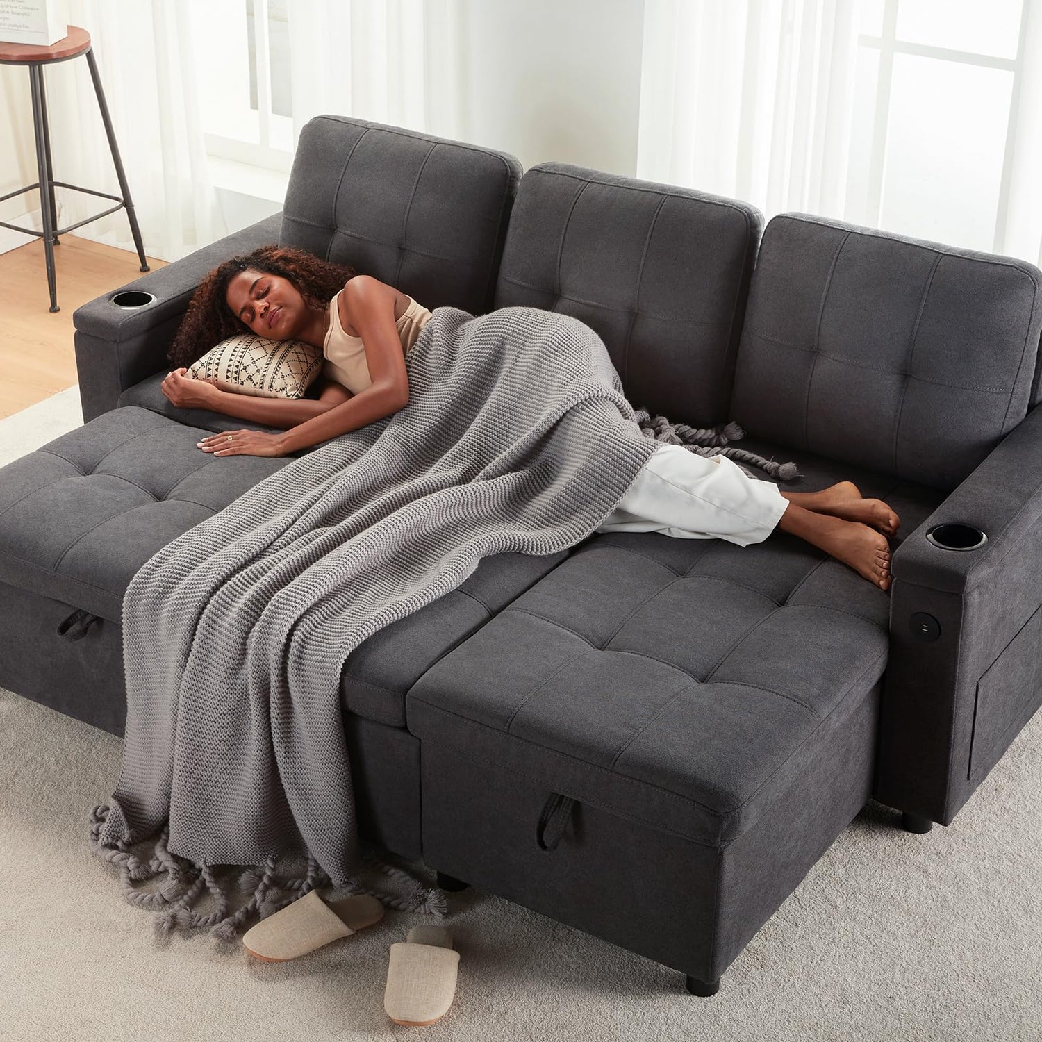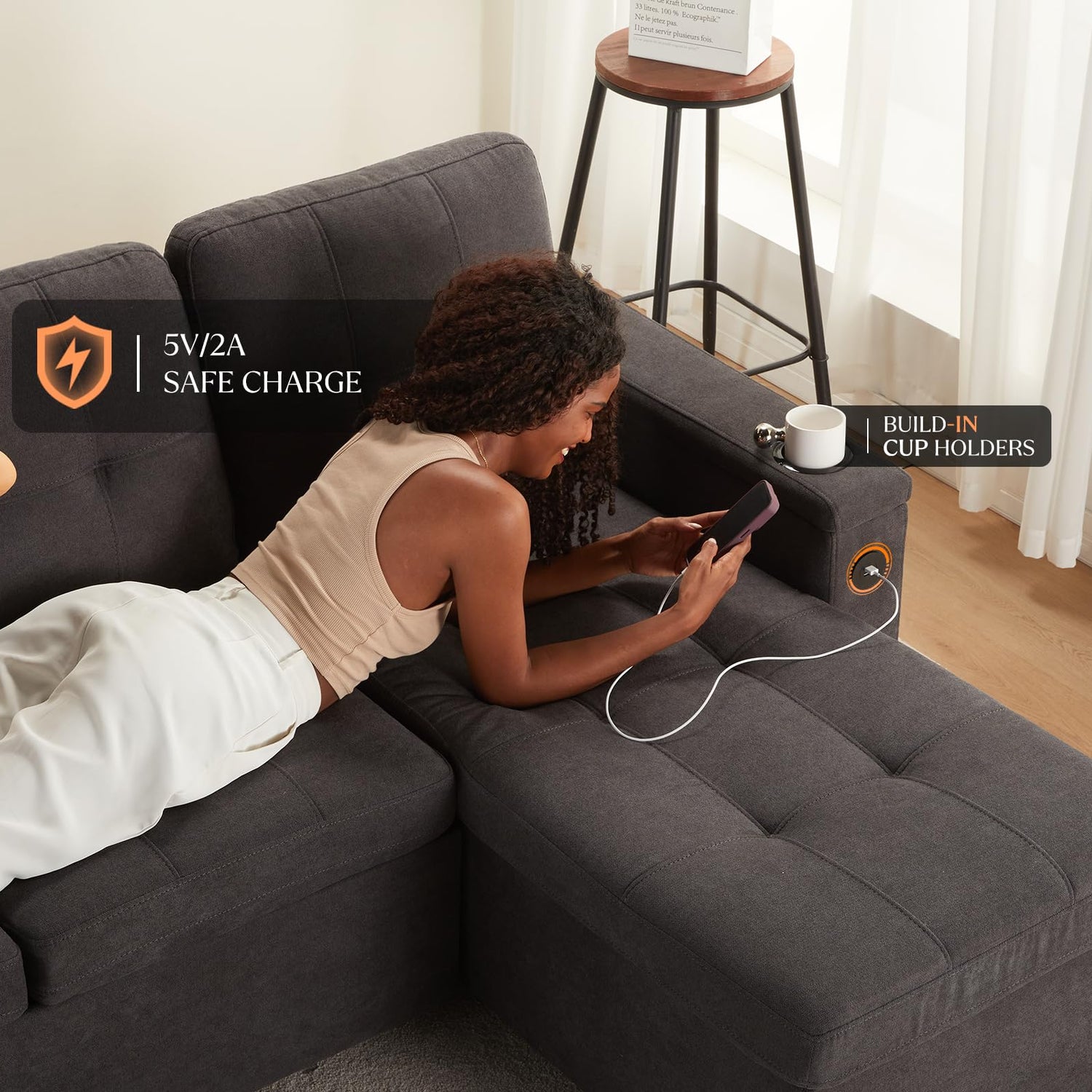 VanAcc Sofa Bed, Sleeper Sofa with USB Charging Ports, L-Shaped Couch with Storage, Pull Out Couch for Living Room, Grey Linen