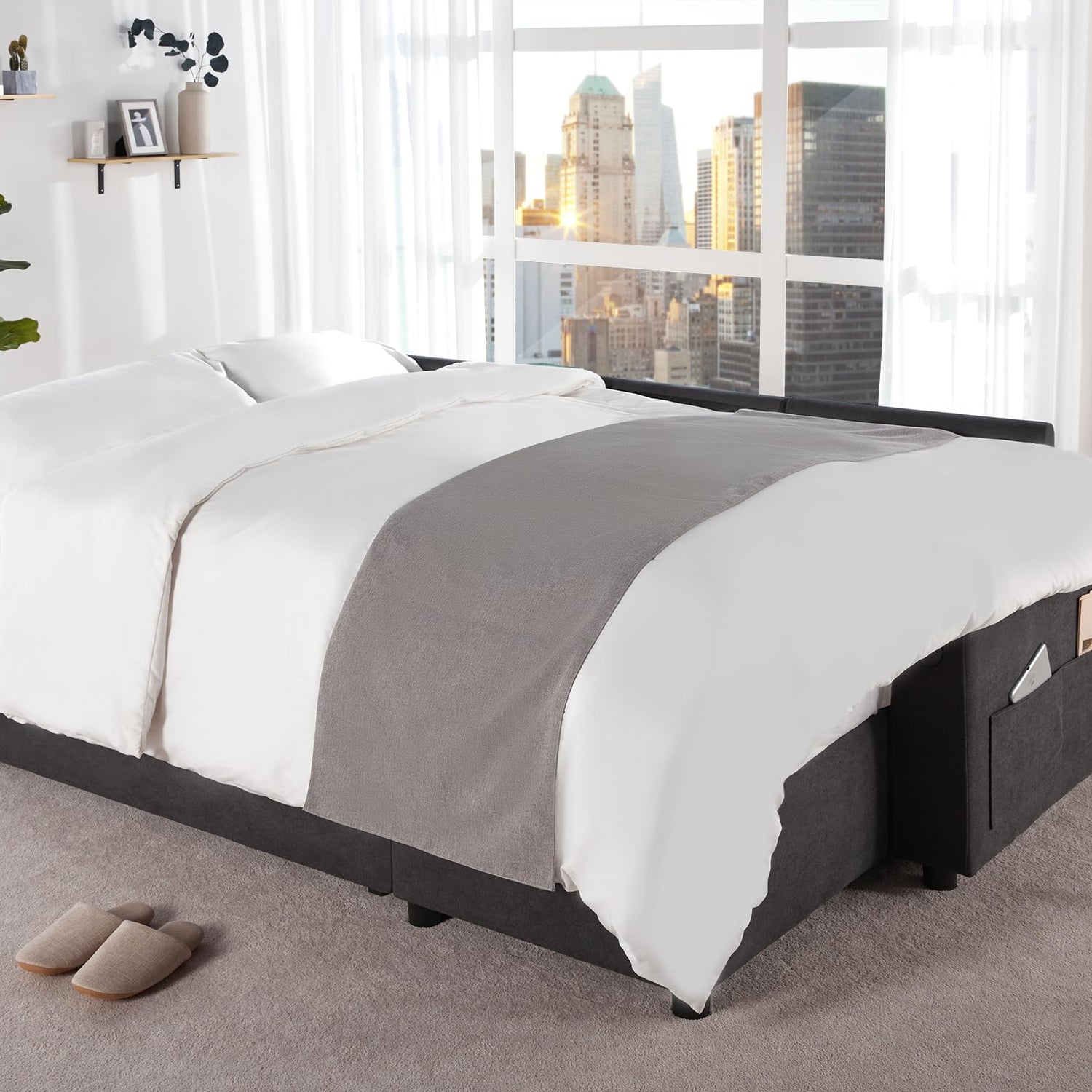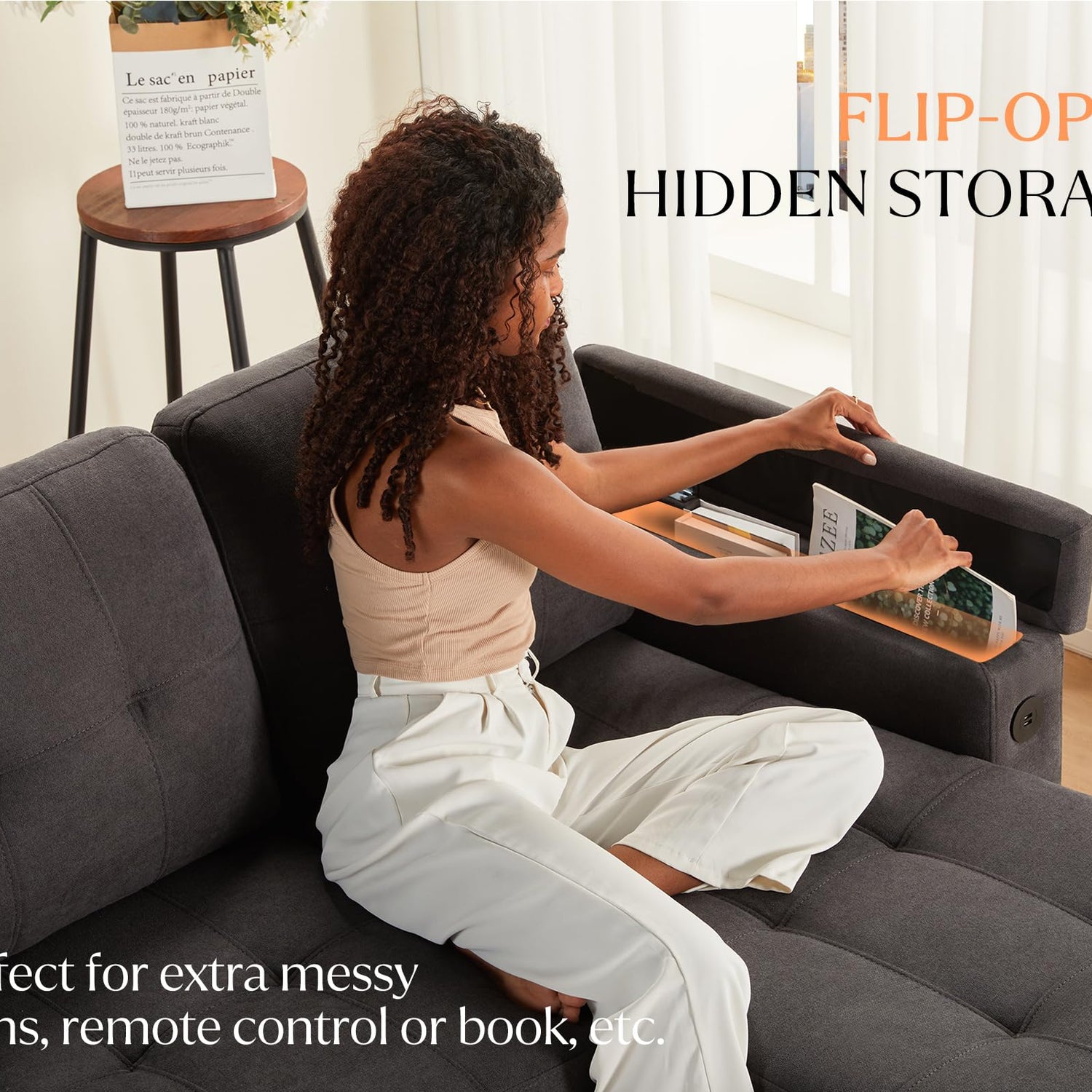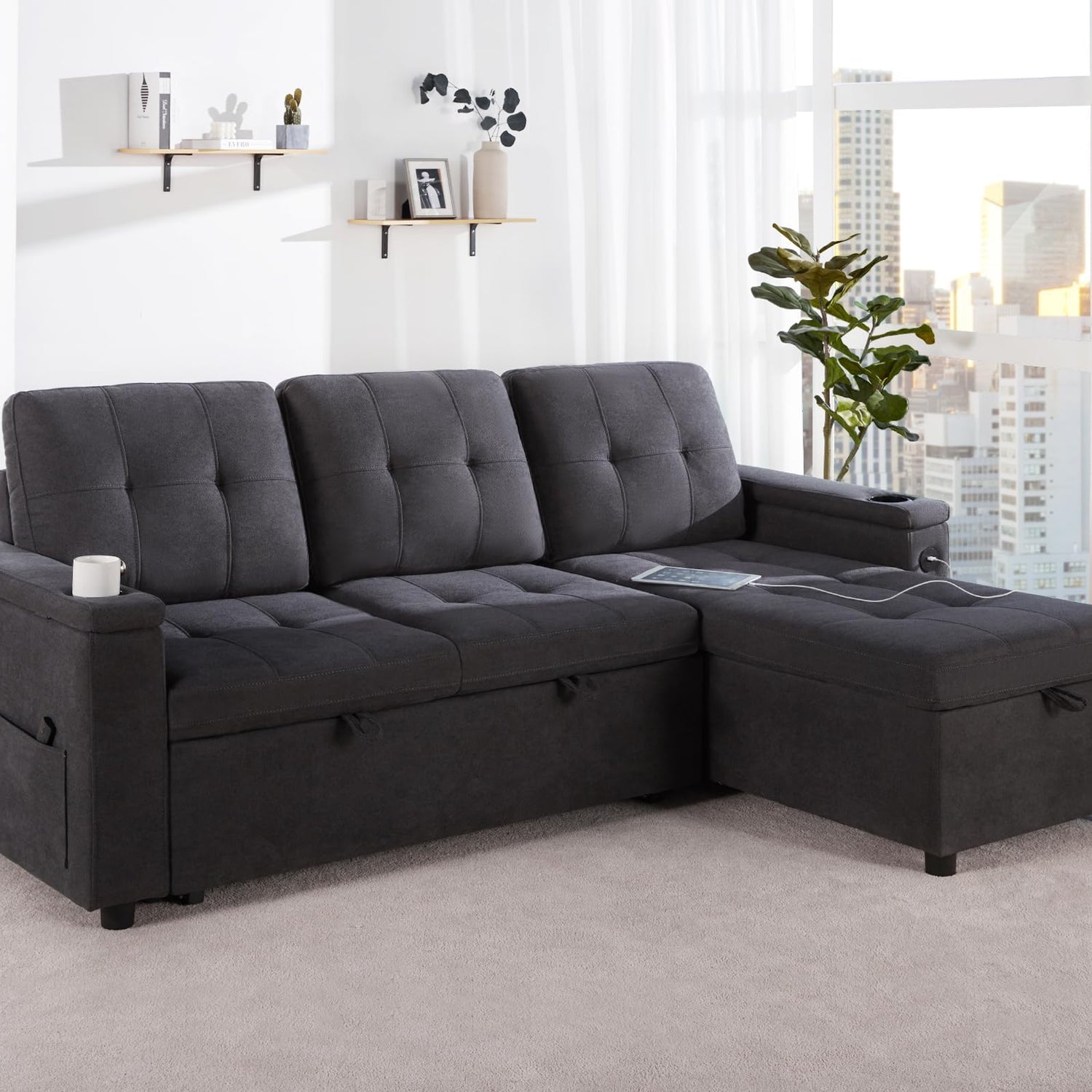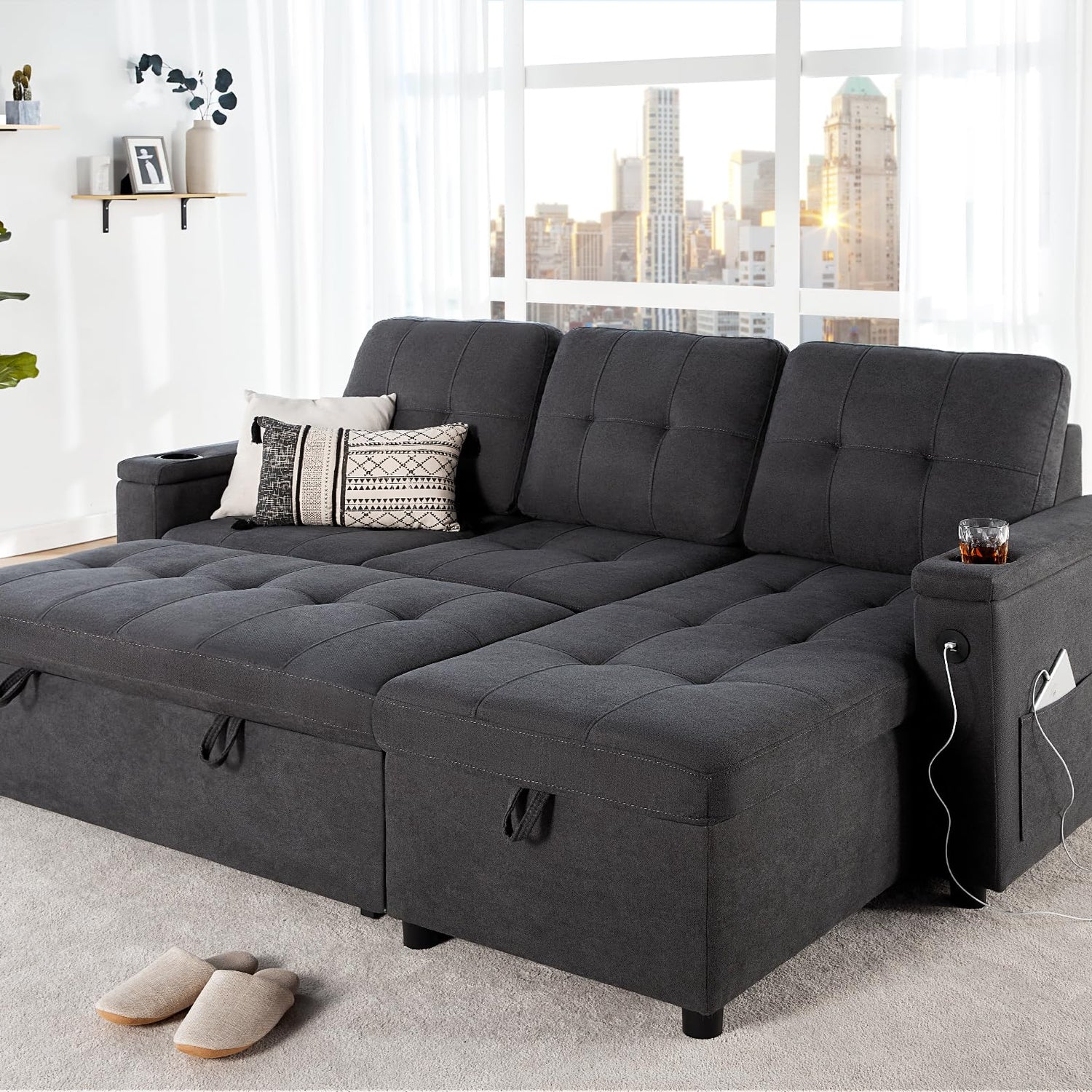 VanAcc Sofa Bed, Sleeper Sofa with USB Charging Ports, L-Shaped Couch with Storage, Pull Out Couch for Living Room, Grey Linen