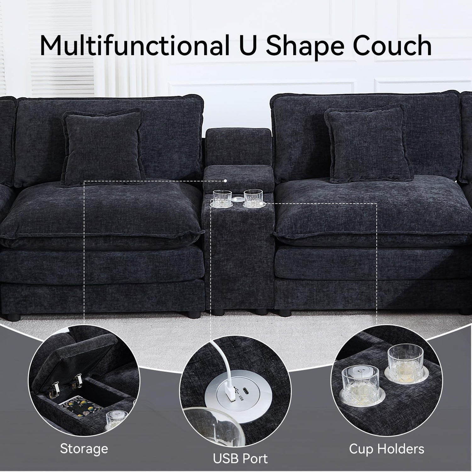 • Multifunctional Sectional Couch: The large U-shaped sofa features a hidden storage space, cup holders and USB port in the center, making it easy to keep drinks within reach and charge your devices while you're watching a movie, reading or chatting casually. Considering the modern family's need for convenient and efficient living, the multifunctional design of our 6 seater sofa greatly enhances the comfort and convenience of home life