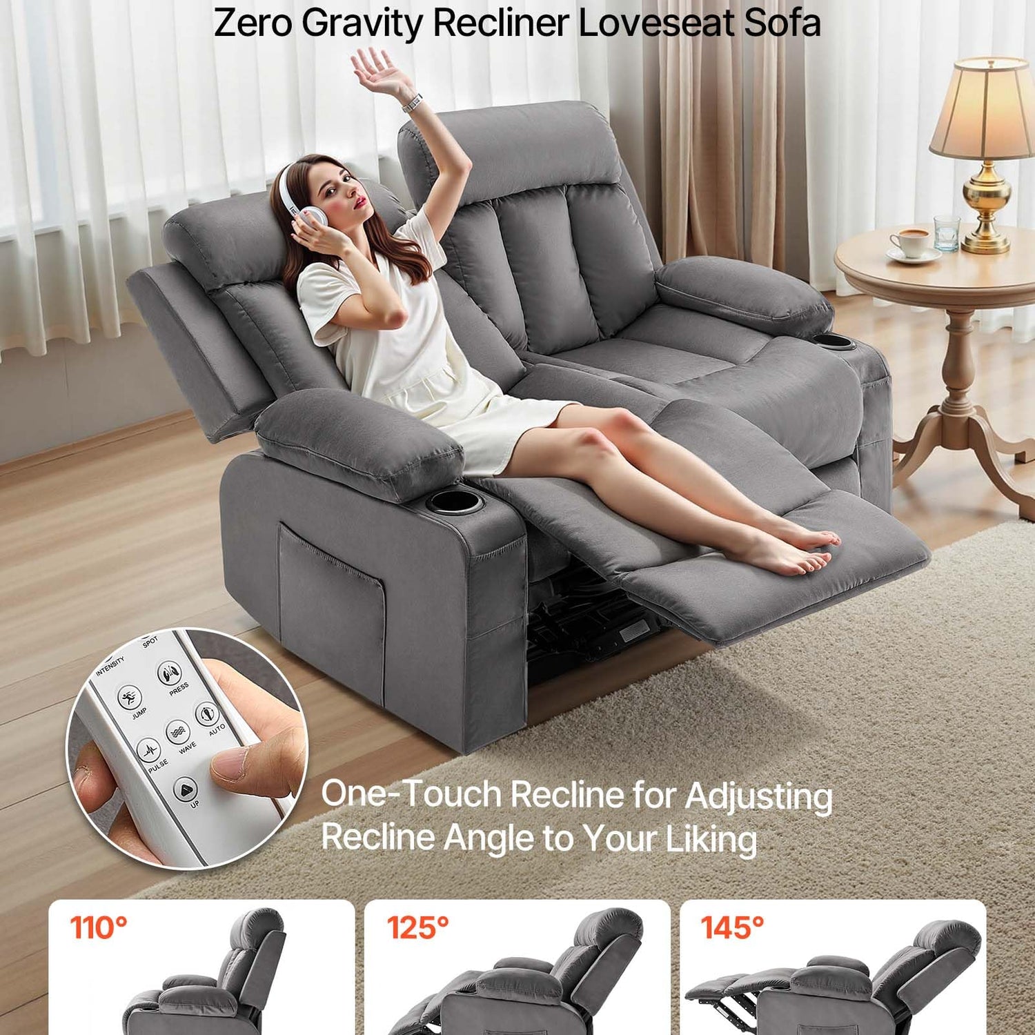 - Electric Recliner Loveseat: With just a press of a button, the loveseat recliner sofa provides adjustable reclining angles from 110° to 145°. Whether you sit upright for reading or reclining, you can position the backrest and footrest to your preferred angle