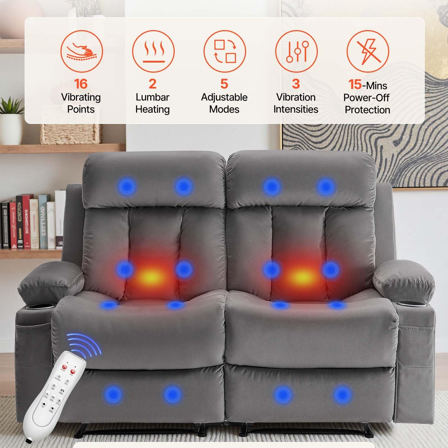 - Vibration Massage & Lumbar Heating: Each seat of our power reclining loveseat has 8 vibration points and 1 lumbar heater with 5 modes and 3 intensity levels, allowing you to personalize your massage and relieve tension in your back, waist, and thighs