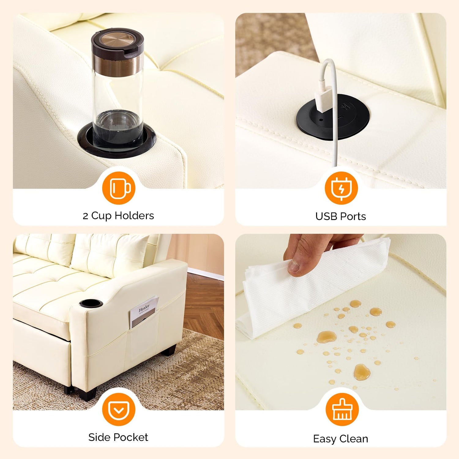 VINGLI Beige Loveseat Sleeper Sofa, Convertible Futon Sofa Bed Faux Leather Pullout Couch Bed with USB Ports, Cup Holders, Armrest for Living Room, Bedroom, Home Office Apartment