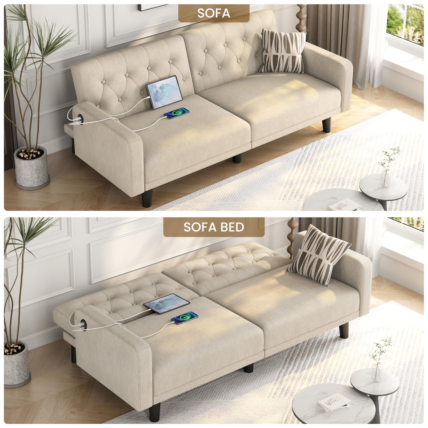 Yaheetech 63" Convertible Couch Small Futon Sofa Bed with 2 USB Ports, Reclining Backrest & Removable Armrests, Mid Century Modern Loveseat for Living Room, Apartment, Office, Beige