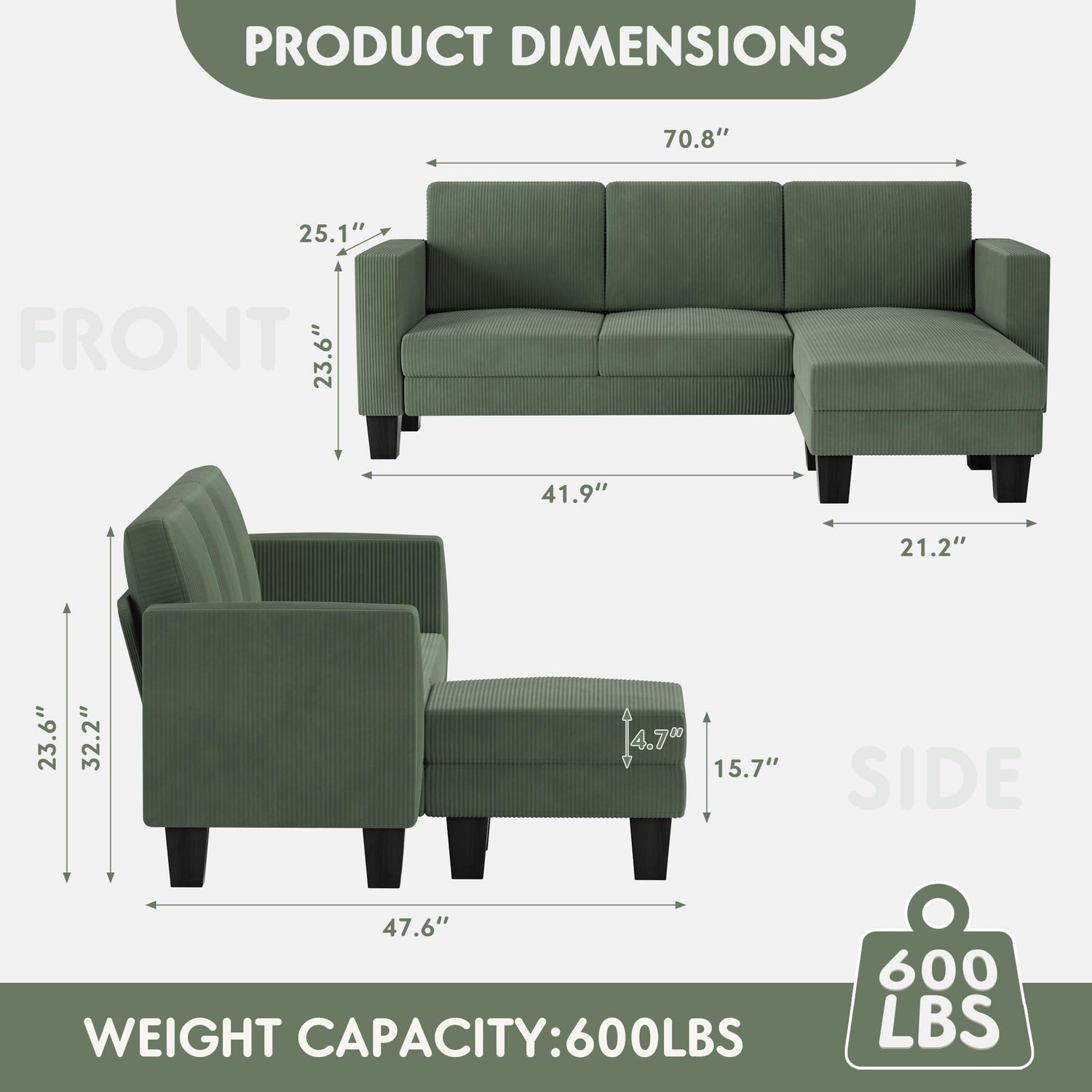 YESHOMY L-shaped Convertible Sectional Sofa, 3 Seater with Corduroy Fabric, Complete with Mobile Footrest, for Living Room, Apartment and Office, 70", Green