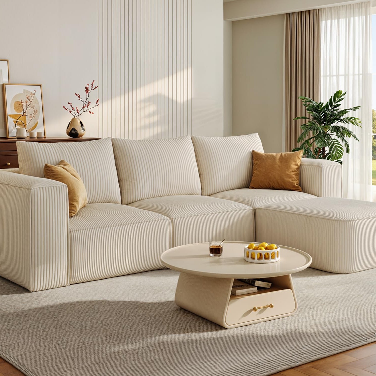 YITAHOME 107 Inch Cloud Modular Sofa with L-Shape Chaise, Deep Seat & 3 Pillows, Corduroy Couch for Living Room Bedroom, No Assembly Needed, Milky White