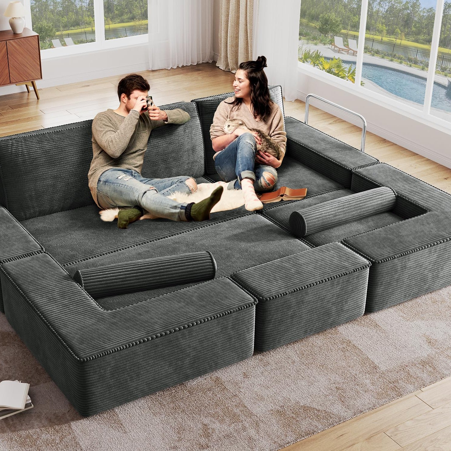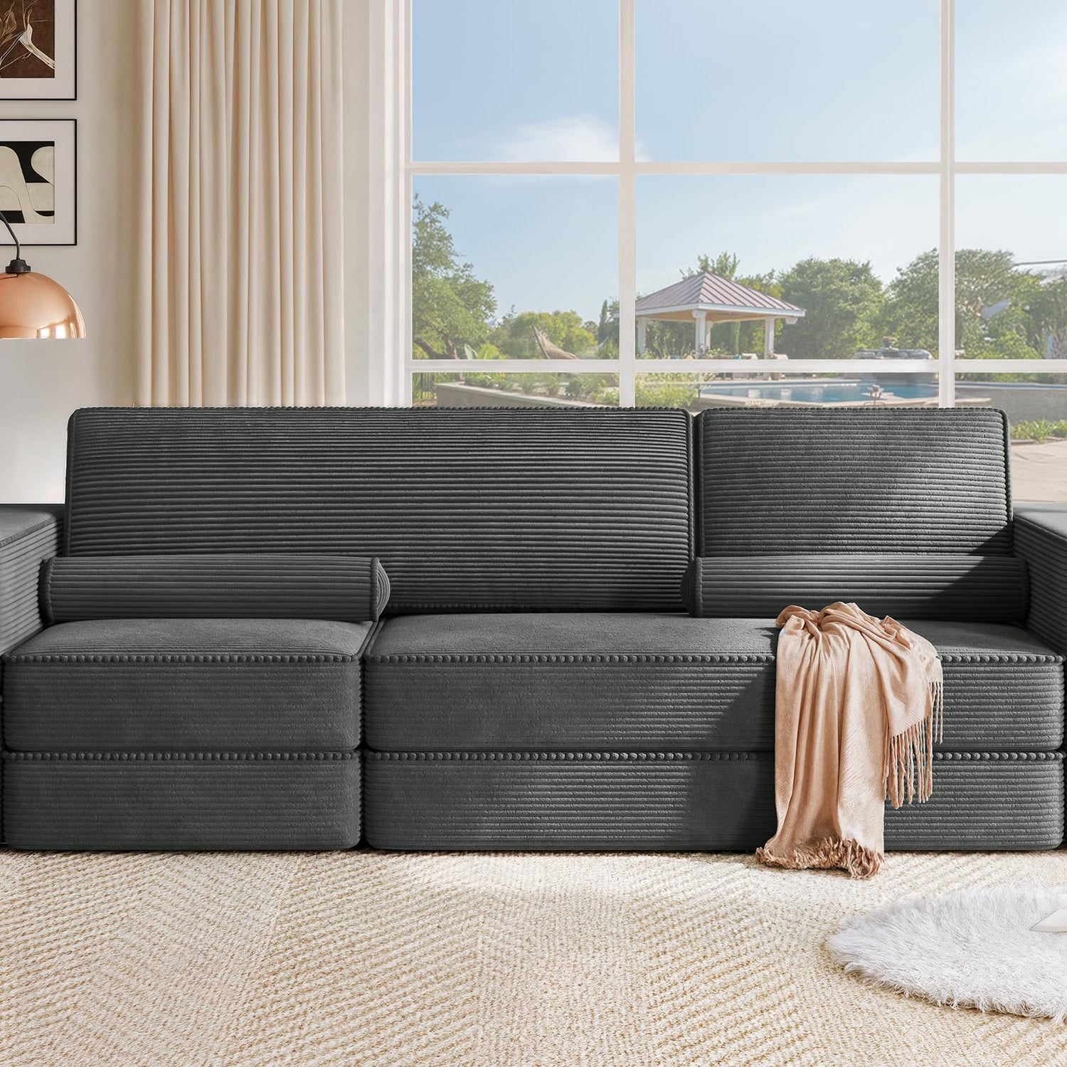 - Sophisticated, Inviting & Pet-Ready:This luxurious corduroy sectional sofa is the epitome of elegance & durability. This floor couch effortlessly enhances any room while withstanding the playful antics of your pets. The easy-to-care-for fabric is also great for your busy, stylish life