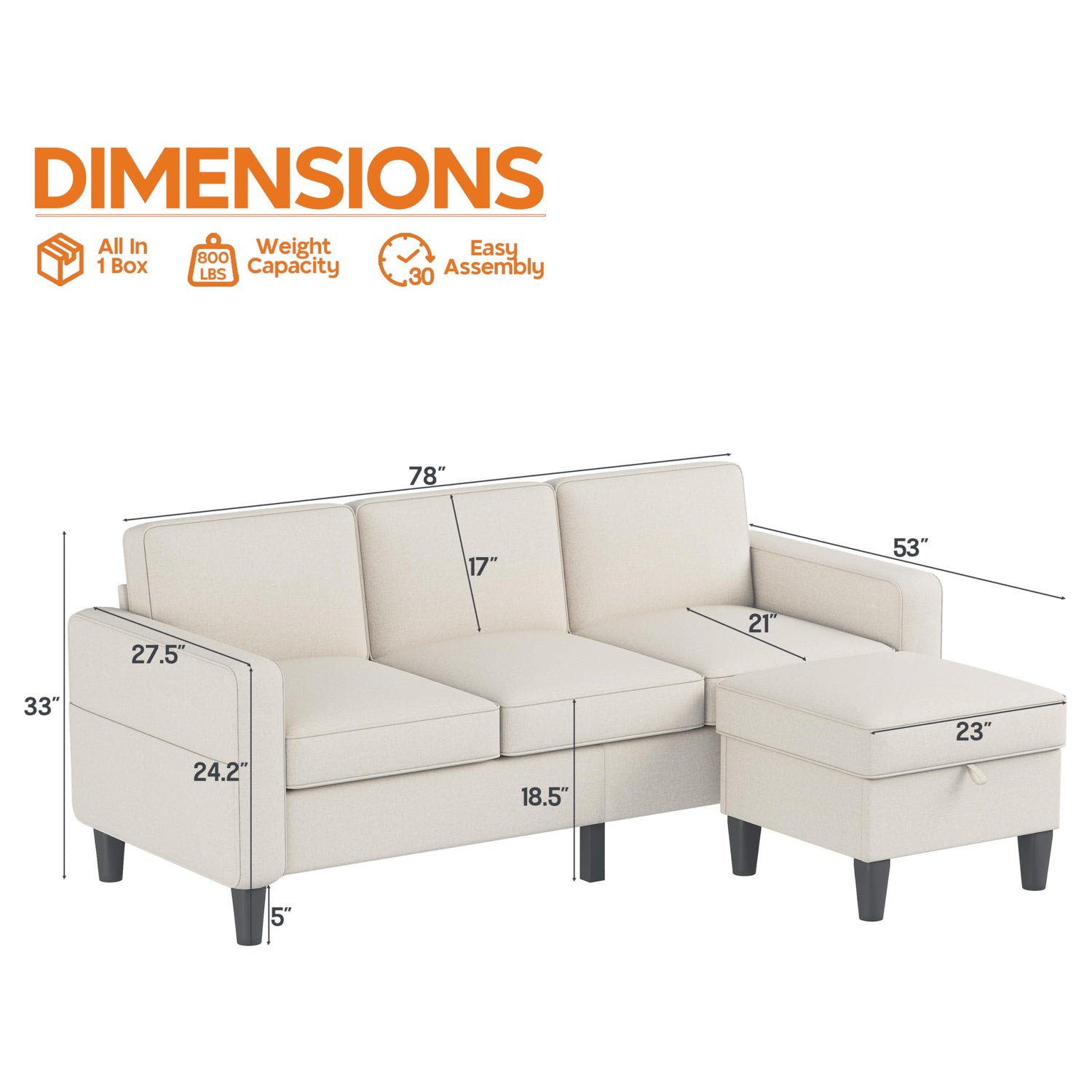 - 【EASY ASSEMBLY】—The 3-seat sofa size is 78"(D)*29"(W)*33"(H), the ottoman size is 25"(D)*23"(W)*17.3"(H). Effectively packed in a box. Equipped with detailed instructions and kits, anyone can easily install it in less than 20 minutes. If you have any questions after purchasing this product, please feel free to contact us. We are happy to serve you.