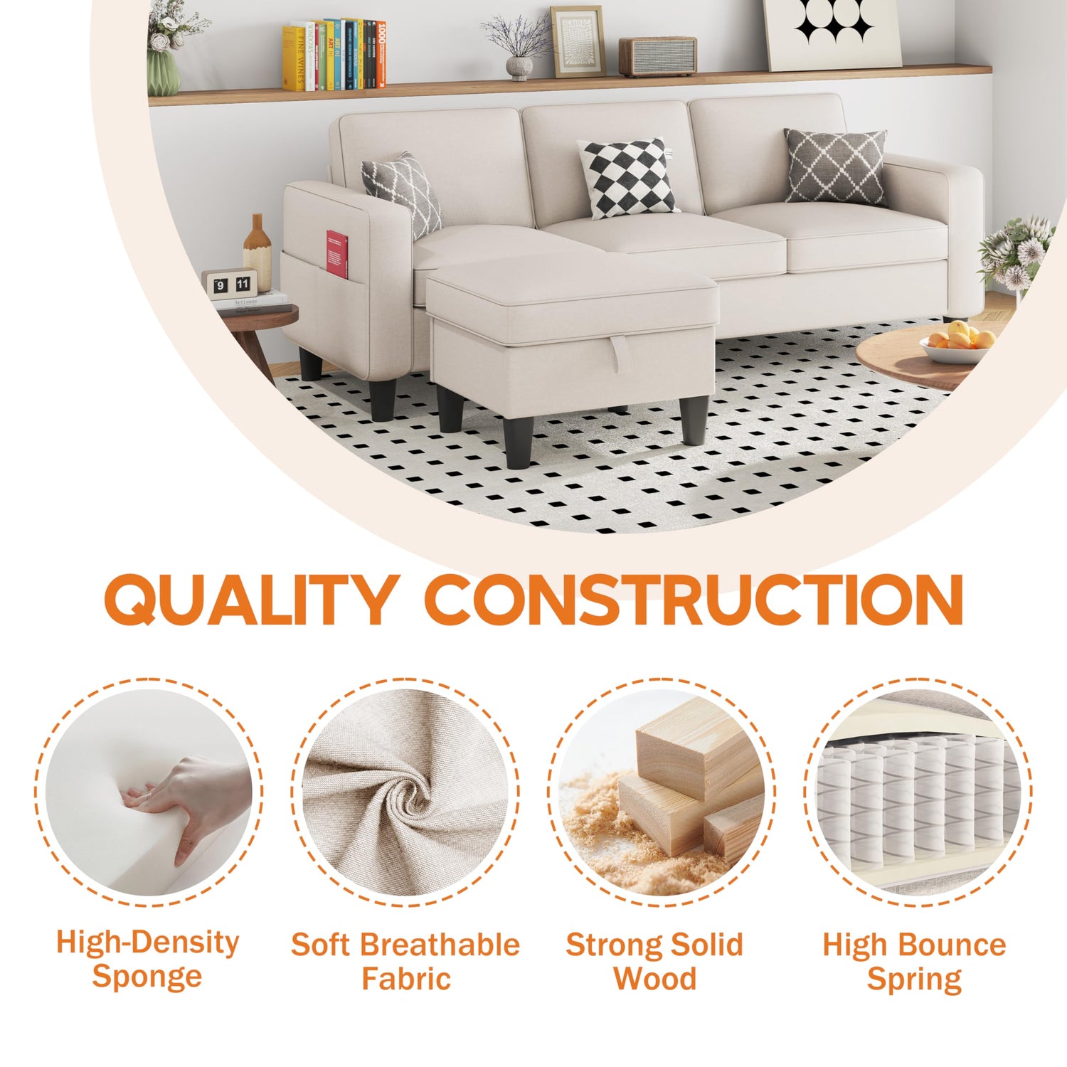 Side storage pockets on both sides of the sofa keep everything within easy reach, organized but not visible! Use it to store your TV remote, phone, glasses, or the book you want to finish.