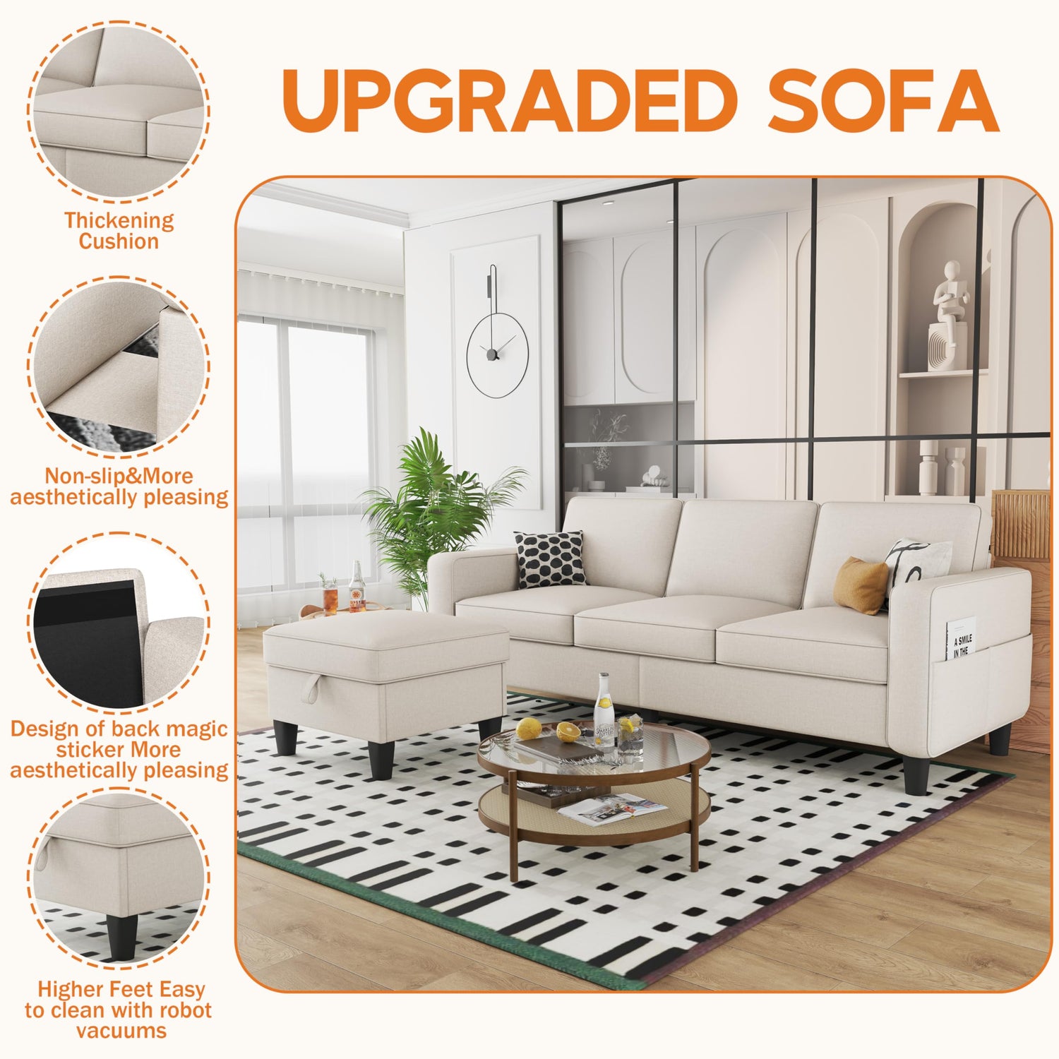 - 【EXTRA STORAGE】—The 3-seater sofa set armrests have large side pockets on the sides, providing plenty of space for magazines, remote controls, and more. The storage function under the ottoman is not only a mecca for children's toys, but also for storing blankets and various items to make the room look neat and clean.