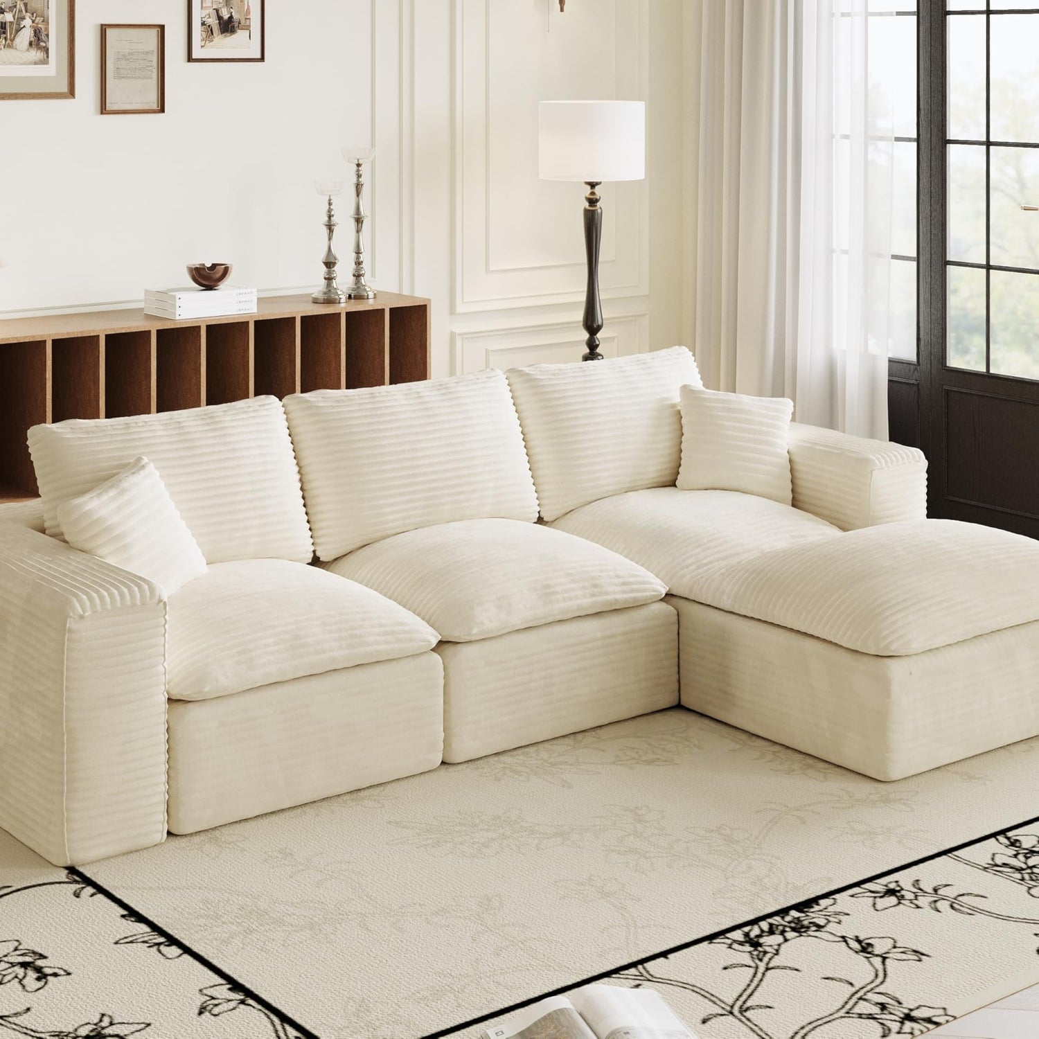 ZIGHTH 108" Plush Corduroy L Shaped Sectional Cloud Sofa Couch with Ottoman, Soft Deep Seat Modular Sectional Couches for Living Room,No Assembly. Beige