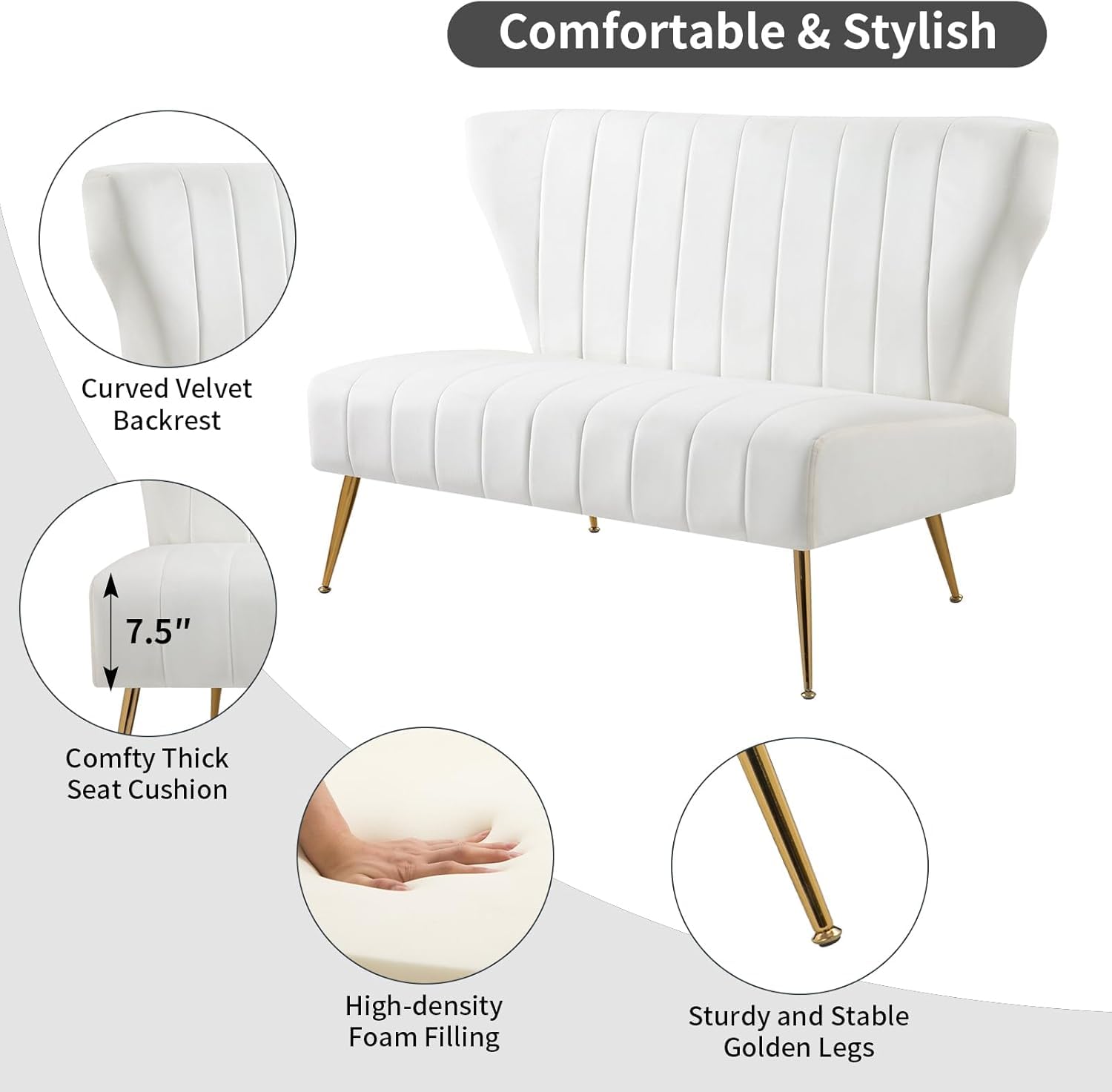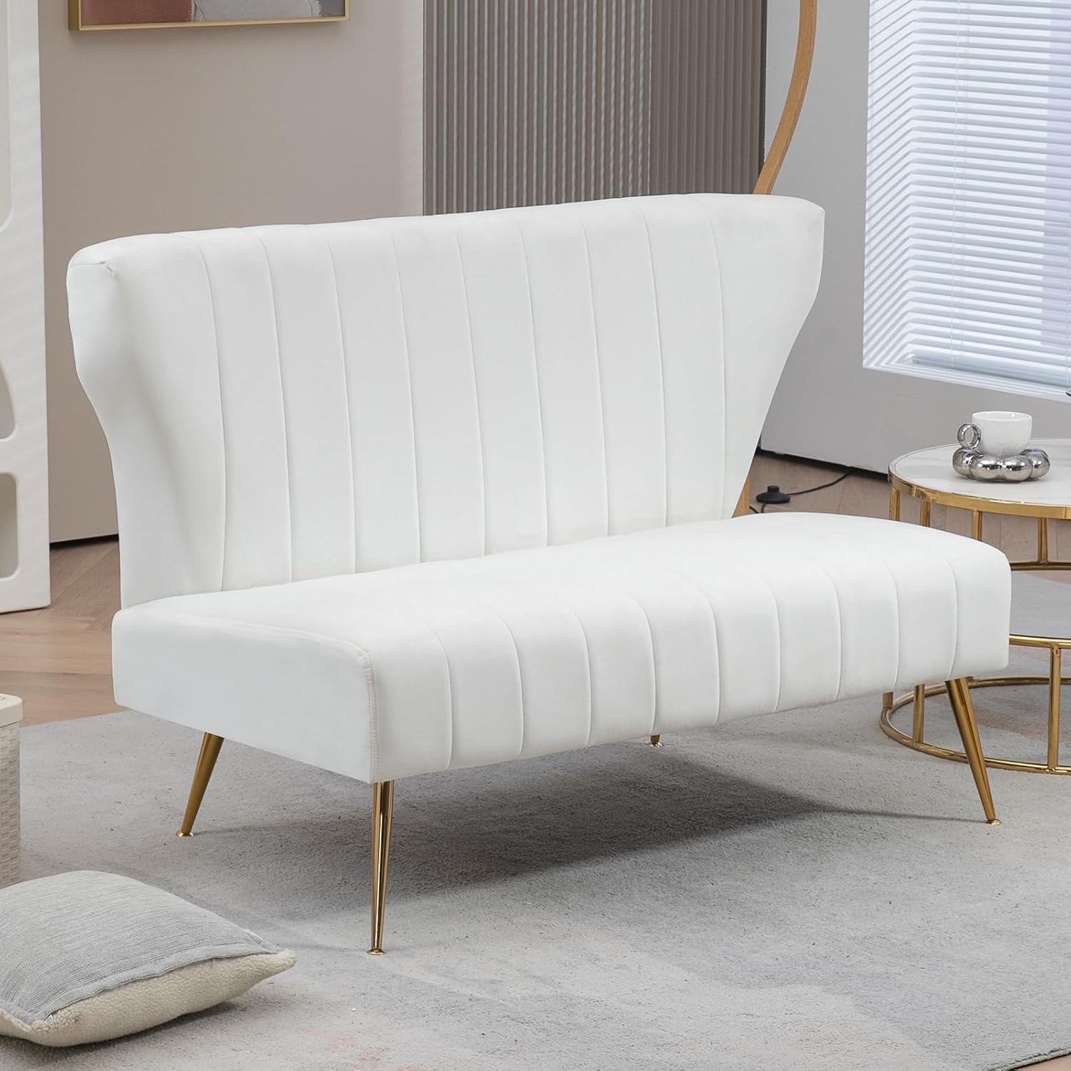 ZJhome 50’’ Armless Loveseat Sofa, Comfy Upholstered Velet Small Couch Sofa with Gold Legs, 2 Seater Tufted Modern Couch for Living Room, Bedroom, Apartment Small Space (White)