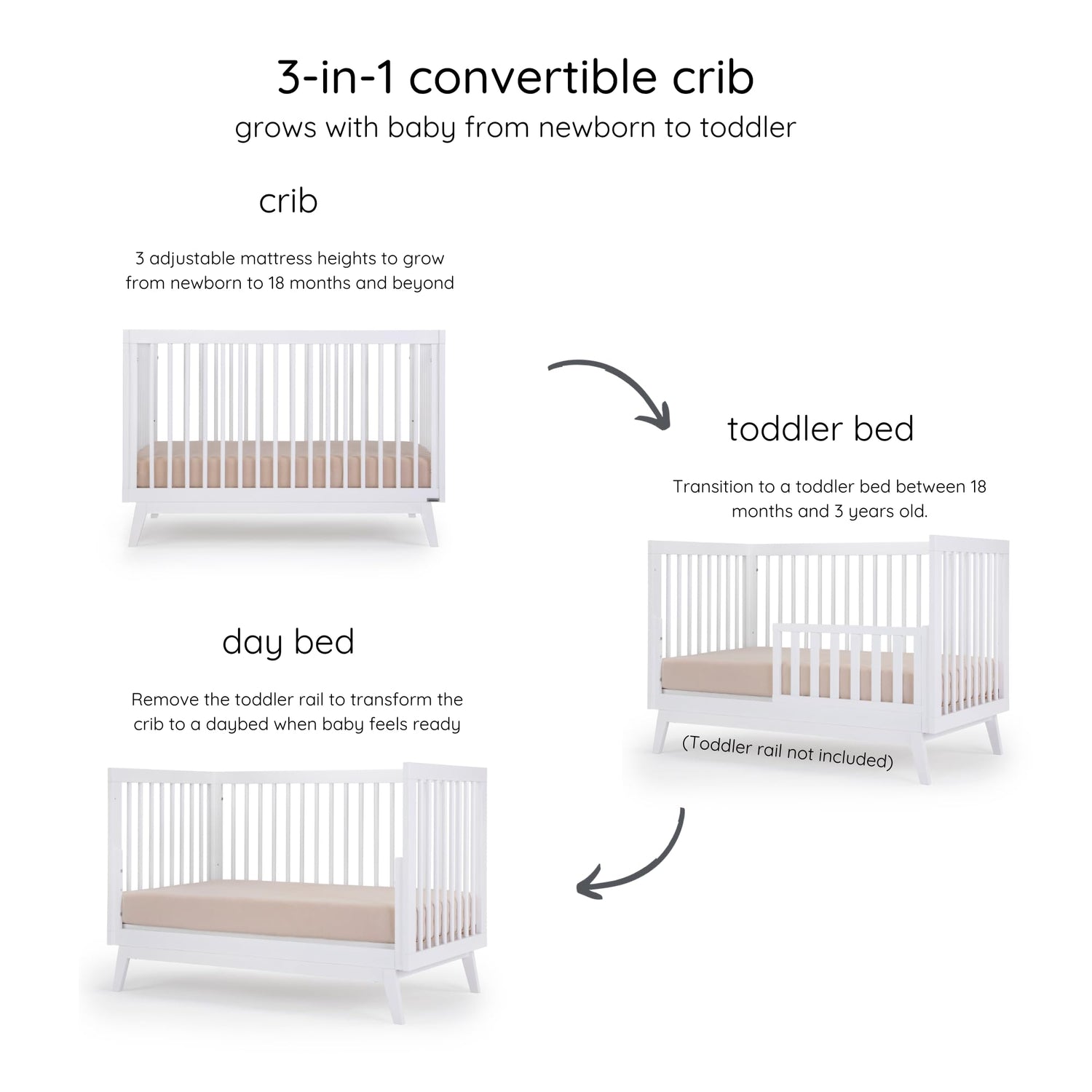 - CONVERTIBLE: Give your kid room to grow! Adjustable mattress height makes it flexible for newborns to toddlers. Converts to a toddler bed or daybed with the toddler rail conversion kit (sold separately). Matching dresser also available.
