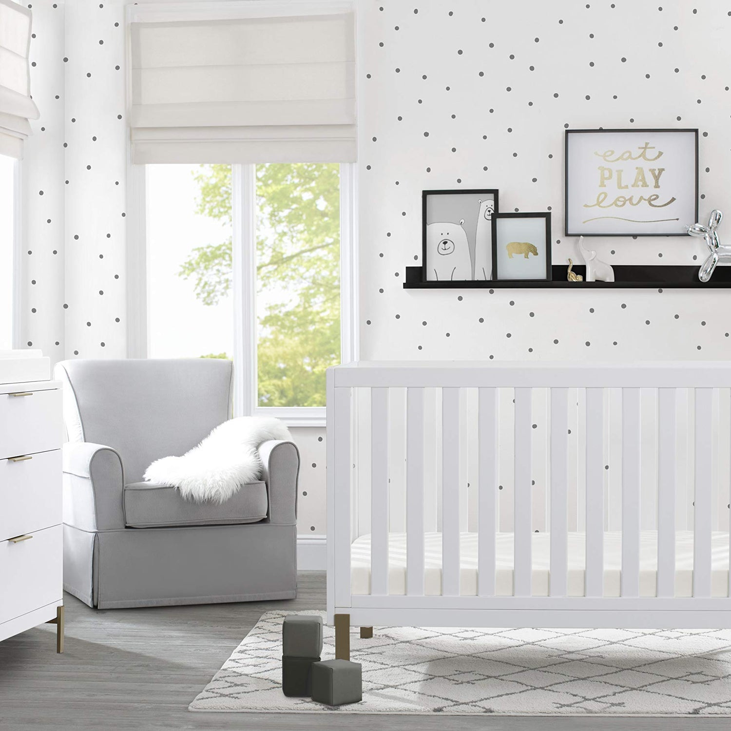 Details: Shake things up in your nursery with the mixed material design of the Hendrix 4-in-1 Convertible Baby Crib by Delta Children. The pine wood construction brings warmth while the shiny bronze legs add a modern, rock and roll flair. Designed to accommodate your growing child, this crib features a three-position adjustable mattress support. Set the mattress at the highest height for your newborn baby, and lower when they begin to sit or stand. And thanks to an easy-to-use Toddler Guardrail #0094 (sold separately), this crib isn’t just a bronze beauty, it’s the only bed your little one will need. Transform it into a toddler bed when the time is right, and then to a stylish daybed when they’re ready for a little more independence. Underneath the crib there’s enough space to fit the coordinating Under Crib Roll-Out Storage Unit #W100950-130 Bianca White or #W100950-1360 Midnight (sold separately).