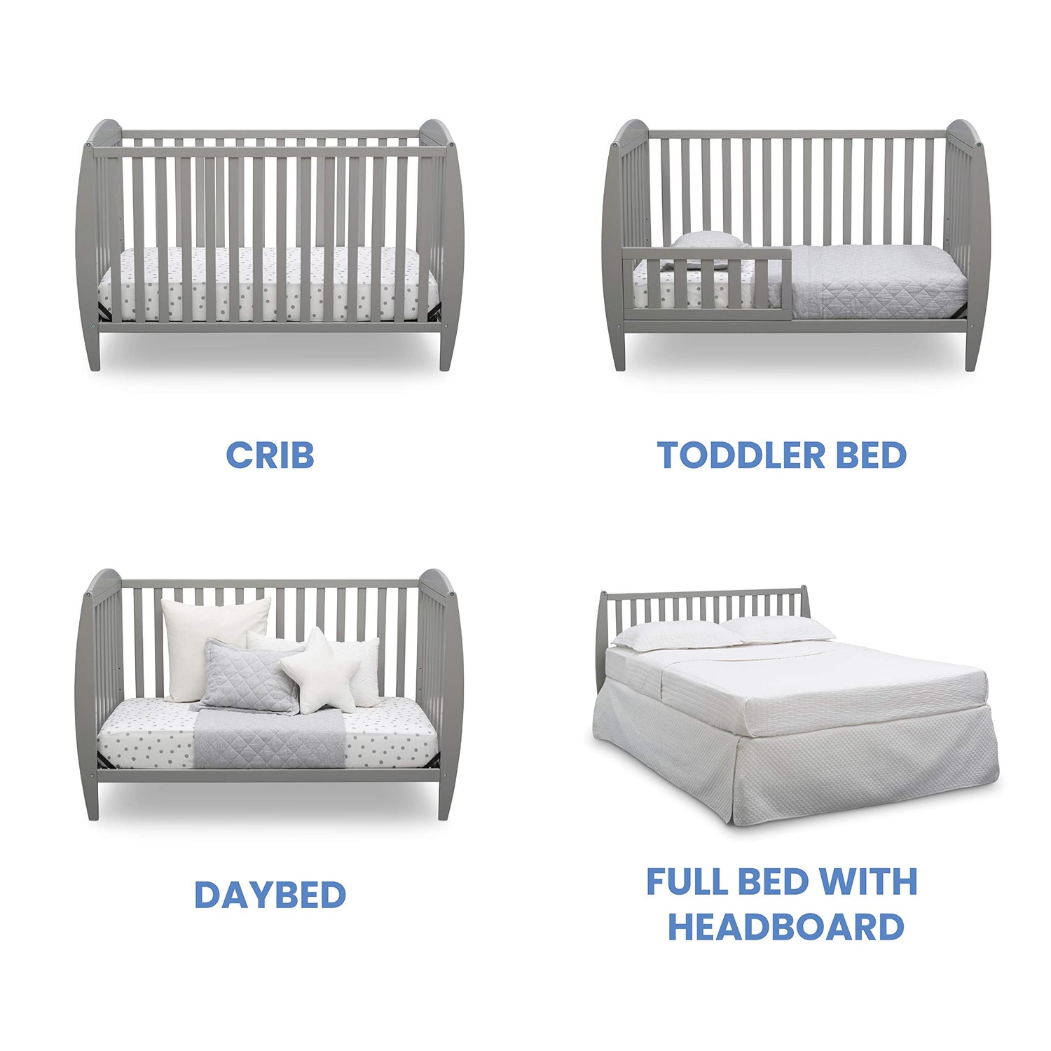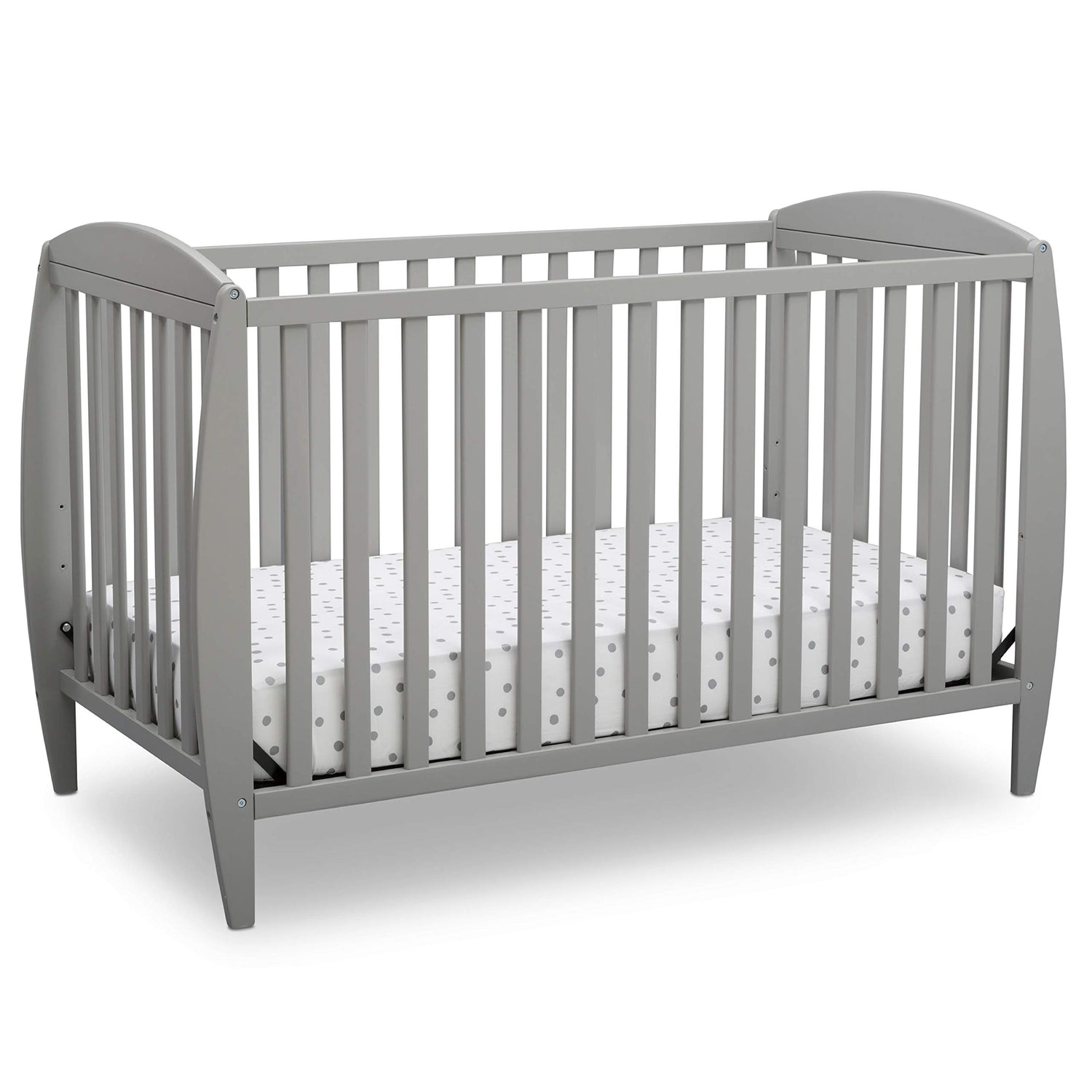 Details: Set the tone for a beautiful and calming nursery with the Taylor 4-in-1 Convertible Baby Crib from Delta Children. The crib's sleigh-style silhouette and open, airy slats puts a playful spin on classic style-just the thing you need to give your baby's room the perfect amount of personality. Built to grow with your child, this crib features an adjustable mattress height that allows you to lower the mattress as your baby begins to stand, plus it converts to a toddler bed, daybed and full size bed. An exceptional value, the Taylor 4-in-1 Convertible Baby Crib from Delta Children provides your little one the right bed for every age and stage. Available in Grey, Bianca White or Dark Chocolate, and coordinates with other furniture from Delta Children in the same finish color to complete your nursery. Delta Children was founded around the idea of making safe, high-quality cribs affordable for all families. That's why all Delta Children cribs are JPMA certified, and are tested above and beyond industry standards.