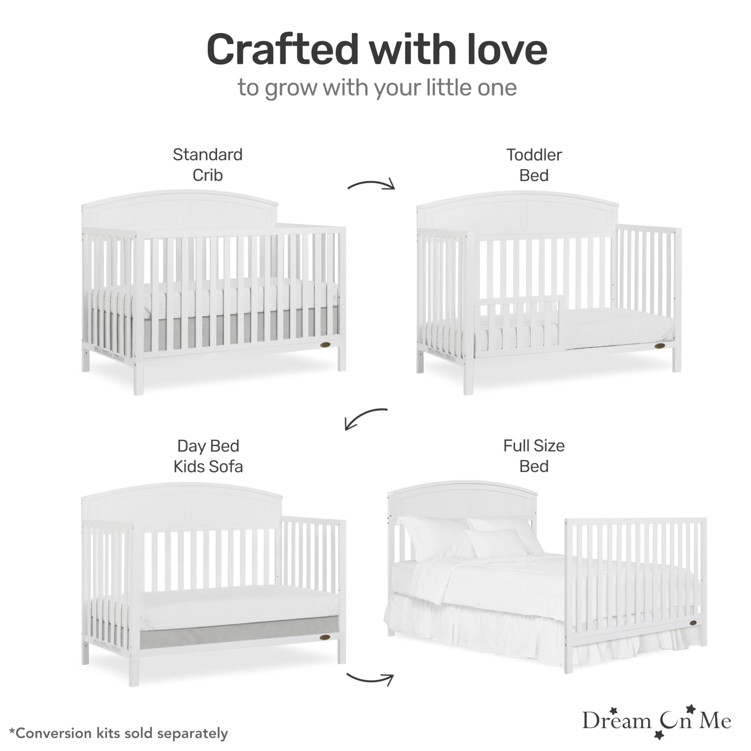 Details: The Dream On Me Storybrooke 5 in 1 Convertible Crib effortlessly converts from crib to daybed, toddler bed & full-size bed (conversion kit sold separately), with a 3-position adjustable mattress height. This crib is JPMA & Greenguard Gold certified, meets/exceeds ASTM & SOR standards, is built with sustainable New Zealand Pinewood and sturdy wooden spindles, with non-toxic, water-based paint, and is easy to assemble and clean. It comes in 2 enticing finishes – White & Pebble Grey.