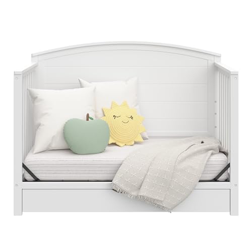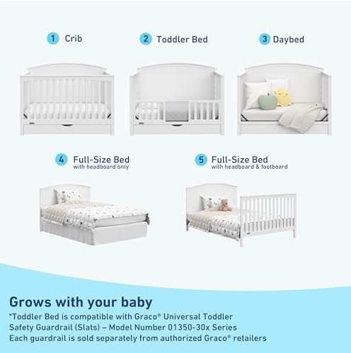 - 5-IN-1 CONVERTIBLE STORAGE CRIB: Converts from baby crib with spacious drawer to toddler bed (compatible toddler guardrails sold separately), daybed, and full-size bed with headboard and optional footboard (compatible conversion kit sold separately)