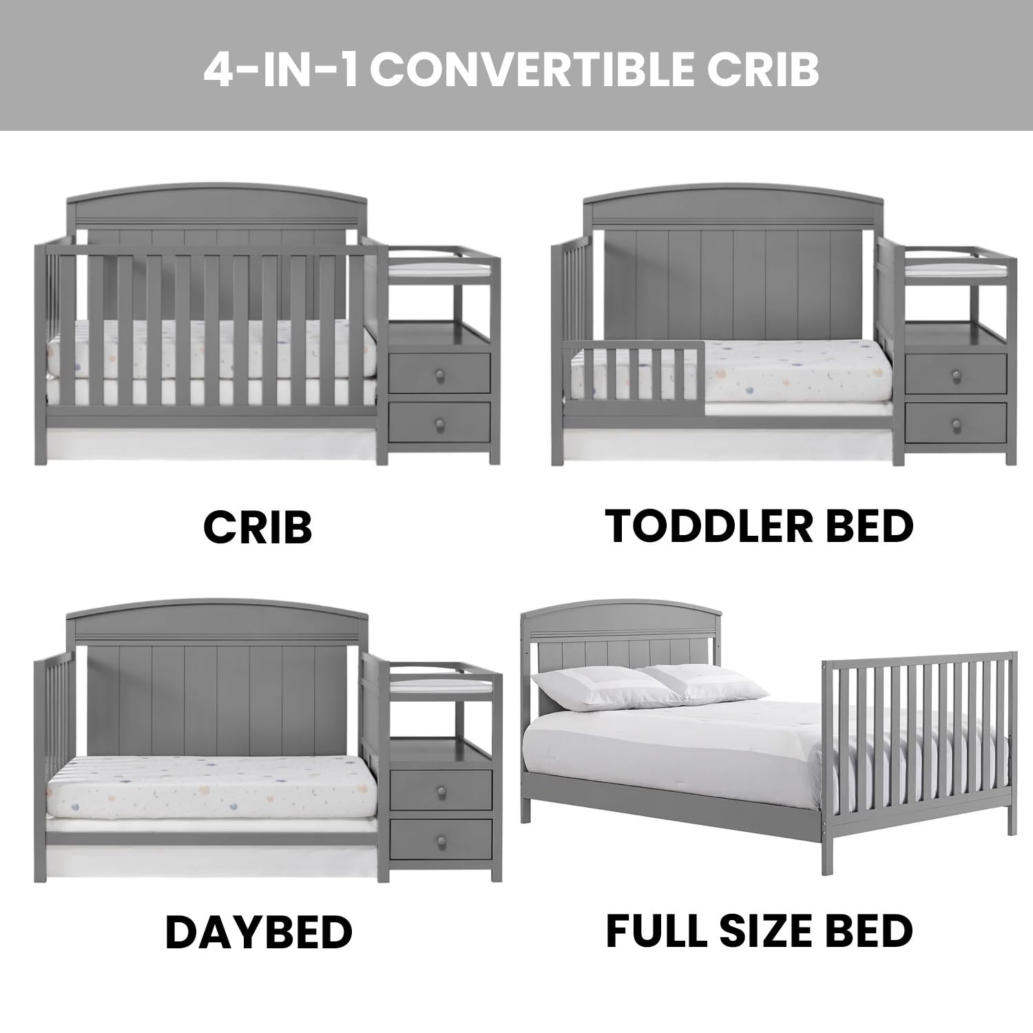 • THOUGHTFUL DESIGN: Designed to fit a standard-size crib mattress, this 4-in-1 Crib offers a convenient design that will grow as your baby grows by converting from a crib to toddler bed, daybed and full-size bed with 3-levels of mattress height adjustments