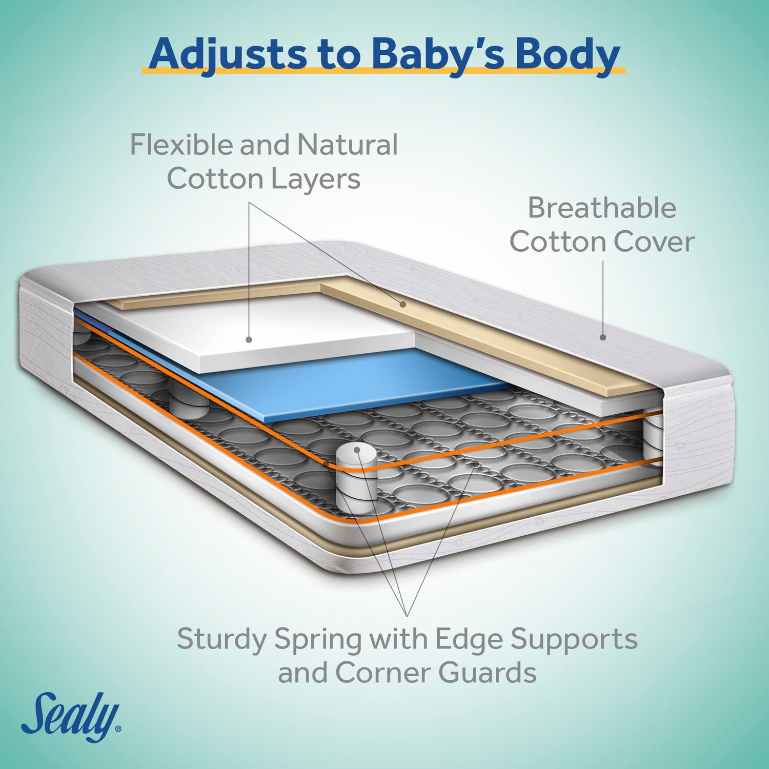A premier choice for both natural comfort and lasting durability, the Sealy FlexCool 2-Stage Baby Crib Mattress and Toddler Mattress is the best baby mattress for your infant or toddler. A natural cotton cover offers breathability on baby's skin plus an airflow pocket allows baby's mattress to breathe. Several layers of natural cotton and sustainable cushioning wrap around the most premium 204 spring core that flex under baby's movement. American-made coils are interwoven and heat-tempered to offer babies and toddlers flexible support that adapts to movement, offering support where they need it most. Steel edge frame and strength pillars create the ultra-firm sides just like an adult mattress. PVC-free waterproof crib mattress protects against leaky messes. The top cover remains breathable and quiet. Sealy Baby crib mattress materials all pass the strictest chemical and air quality tests including flammability and federal durability and impact testing. Coil mattresses pass more ASTM crib mattress standards than foam crib mattresses. Greenguard Gold Certified for air quality and a healthier indoor environment for babies. Rest easy knowing your baby's mattress is firm, durable, waterproof and tested to be safe from harsh chemicals. Families choose Sealy Baby crib mattresses for safety, support and comfort. Passes Children's Safe Products Act and does not contain phthalates, lead, latex, or harsh VOCs. Measuring almost 52x28x5.5 inches, its a standard crib mattress size offering a snug fit in baby's crib or toddler beds. Lightweight to easily change crib sheets. Sealy is America's Most Trusted mattress brand. Highly rated breathable baby crib mattresses help your baby sleep peacefully and you can sleep better knowing Sealy has supported infants and toddlers for decades.