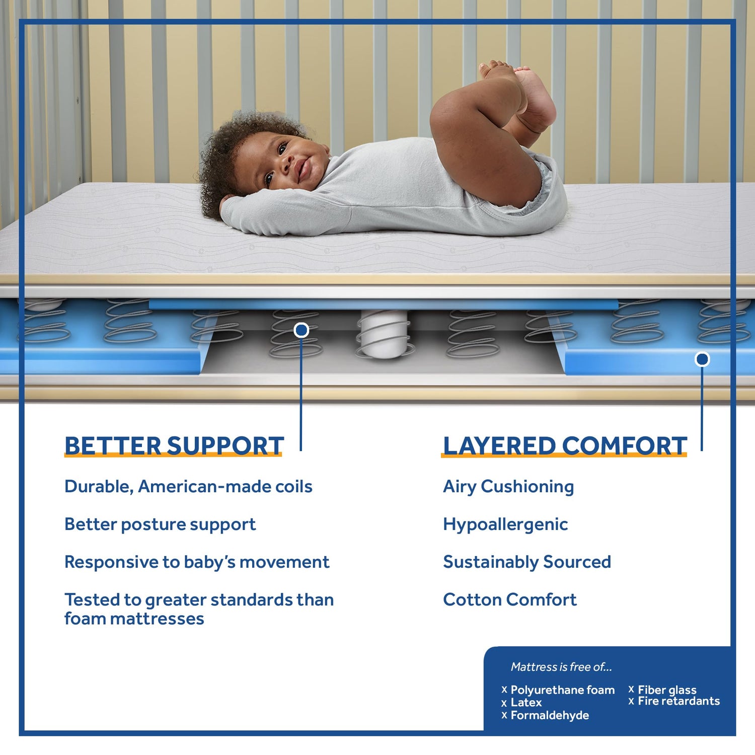 • DURABLE POSTURE SUPPORT: Premium American steel coils flex to adjust to baby's body. Sustainable & natural cotton comfort padding all around. Steel edges plus corner/side strength pillars for safe crib bed mattress design maintains firmness as baby grows