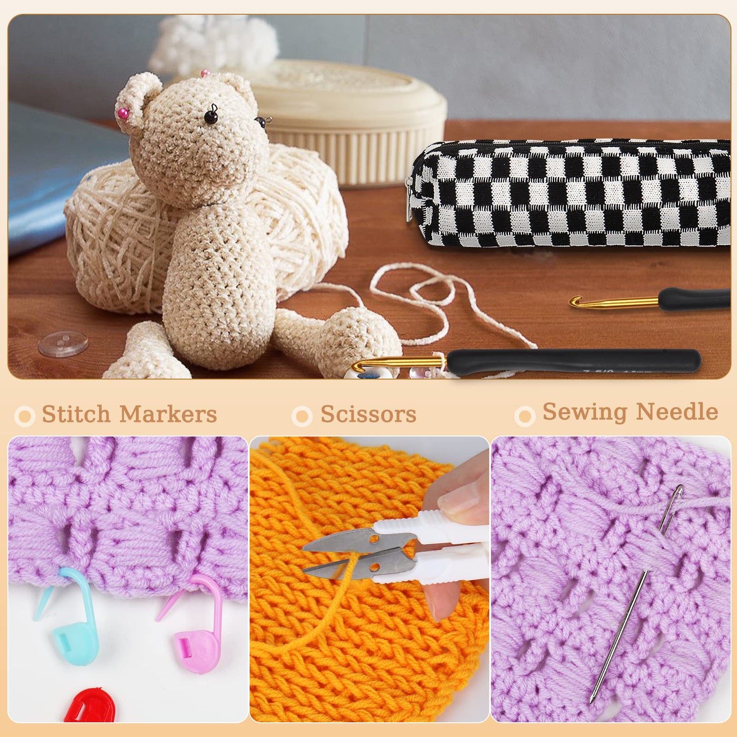 - [Great Value] You will get 9 ergonomic crochet hooks, 10 stitch markers, 9 big eye blunt needles with 1 needle bottle, 1 scissors and 1 matching crochet case. A handy and practical crochet set, the best gift for a crochet lover.
