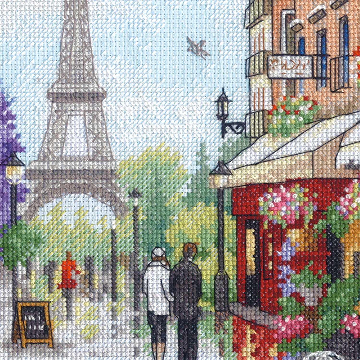 - Our advanced cross stitch design depicts a quaint cobblestone Parisian street lined with charming cafés and boutiques