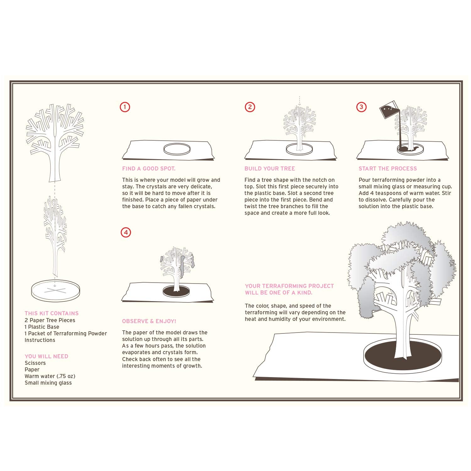 - The kit includes a paper tree form, tray, terraforming solution and instructions.