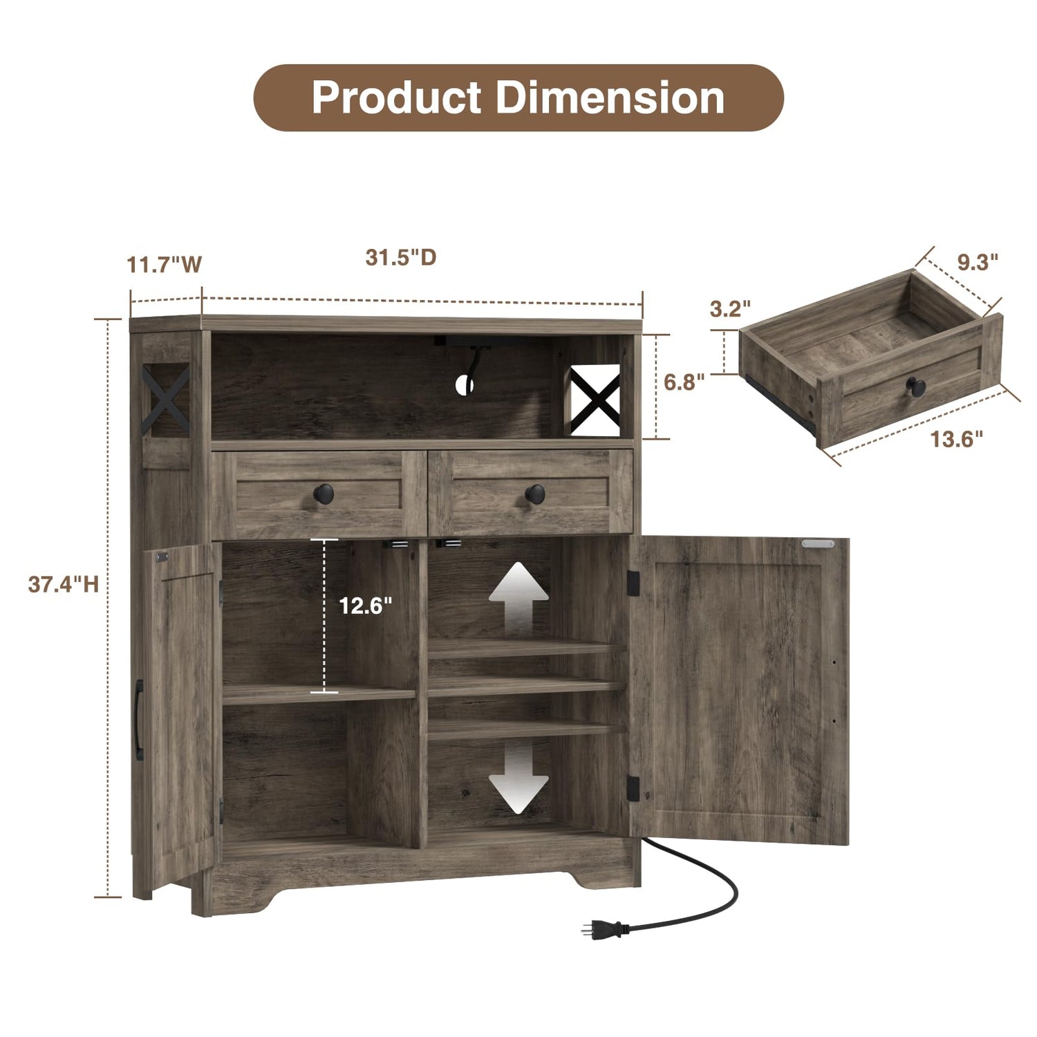 • Sturdy And Stable: This farmhouse storage cabinet is constructed with high-end engineered wood and strengthened wood bottom, which ensures exceptional stability and durability, promising years of reliable service. The tabletop can support up to 110lbs. Overall Dimensions: 11.8"D x 31.5"W x 37.4"H