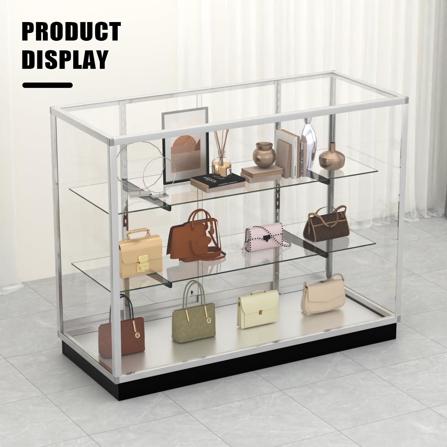 - Adjustable Tempered Glass Shelves – Safely holds a variety of products and display sizes.