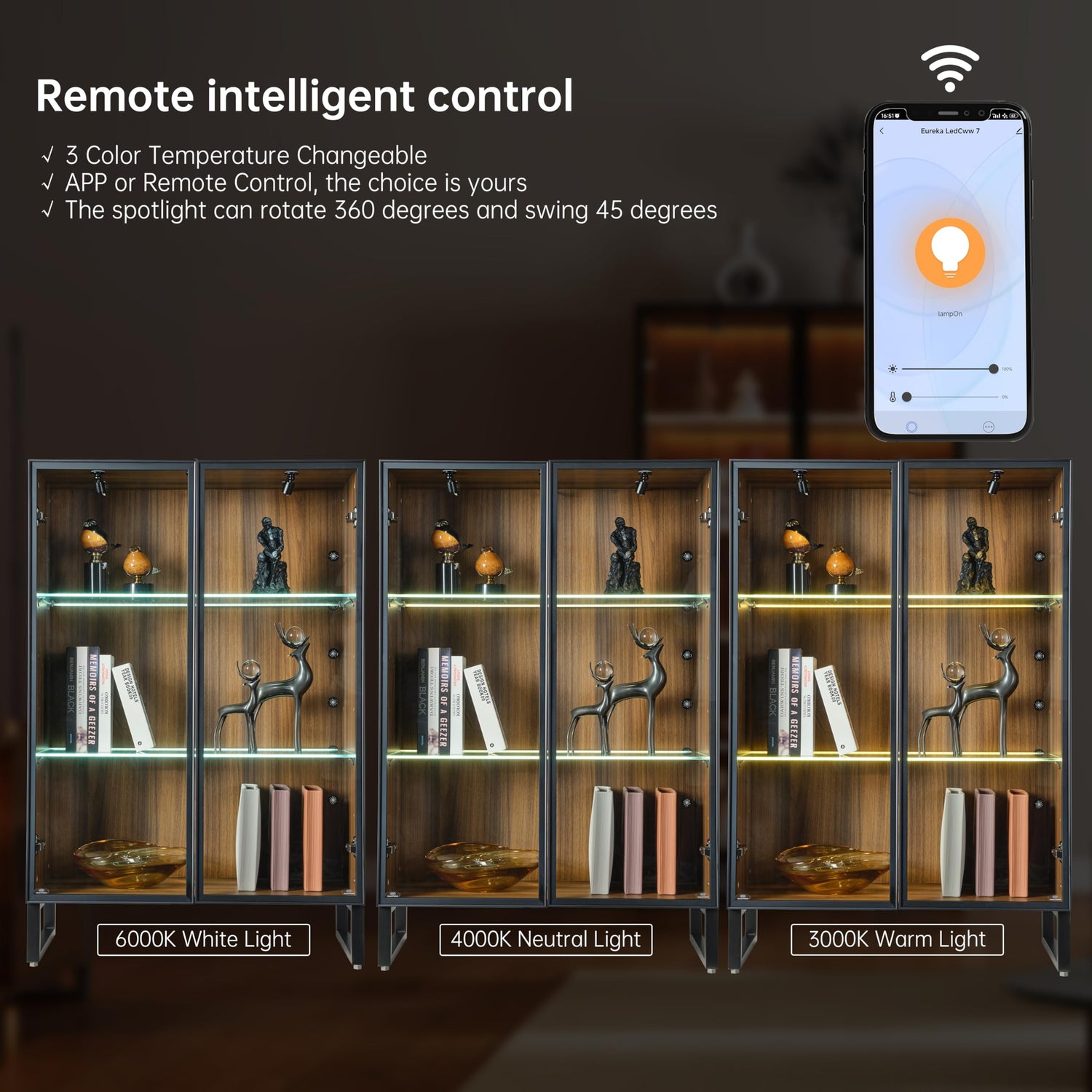- 【Adjustable LED Light】: EUREKA display cabinet can remotely control the color temperature and brightness of the light through the APP or remote control, and there are 3 light color temperature options to meet your lighting needs: warm light, neutral light, and white light. The 3 small spotlights on the top support a wide range of adjustable direction, 360-degree rotation and 45-degree swing. Simply plug in and illuminate your gorgeous collection and your treasures at any time of the day, creating an excellent visual experience for you!