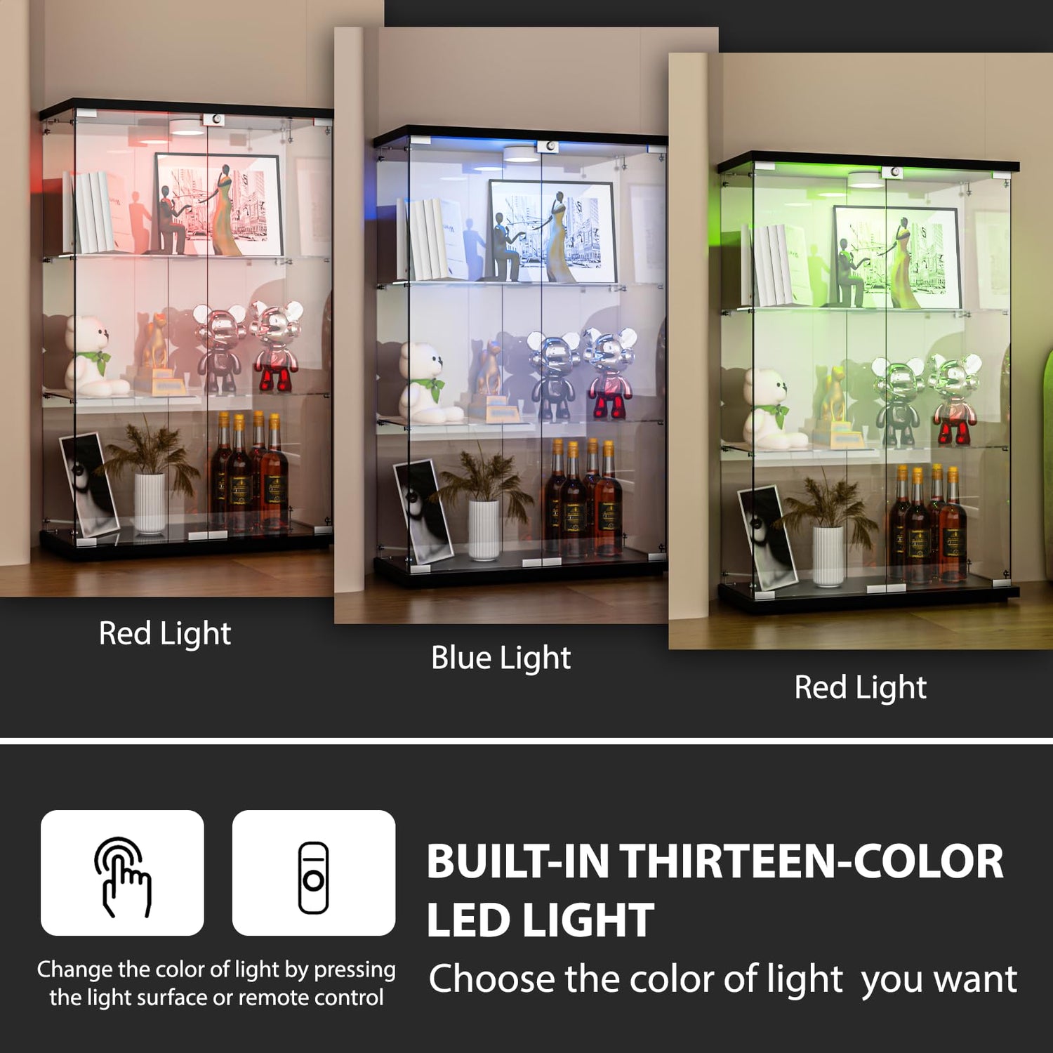 - [MULTI Function] This multi-functional glass display cabinet can hold various collections, trophies, books, dishes, etc. With LED light, your collection would be showed more vivid.The frameless transparent appearance presents a better-looking and clearer display of your items, beautiful and fashionable, can also be placed in different places, such as the living room, bedroom, and kitchen