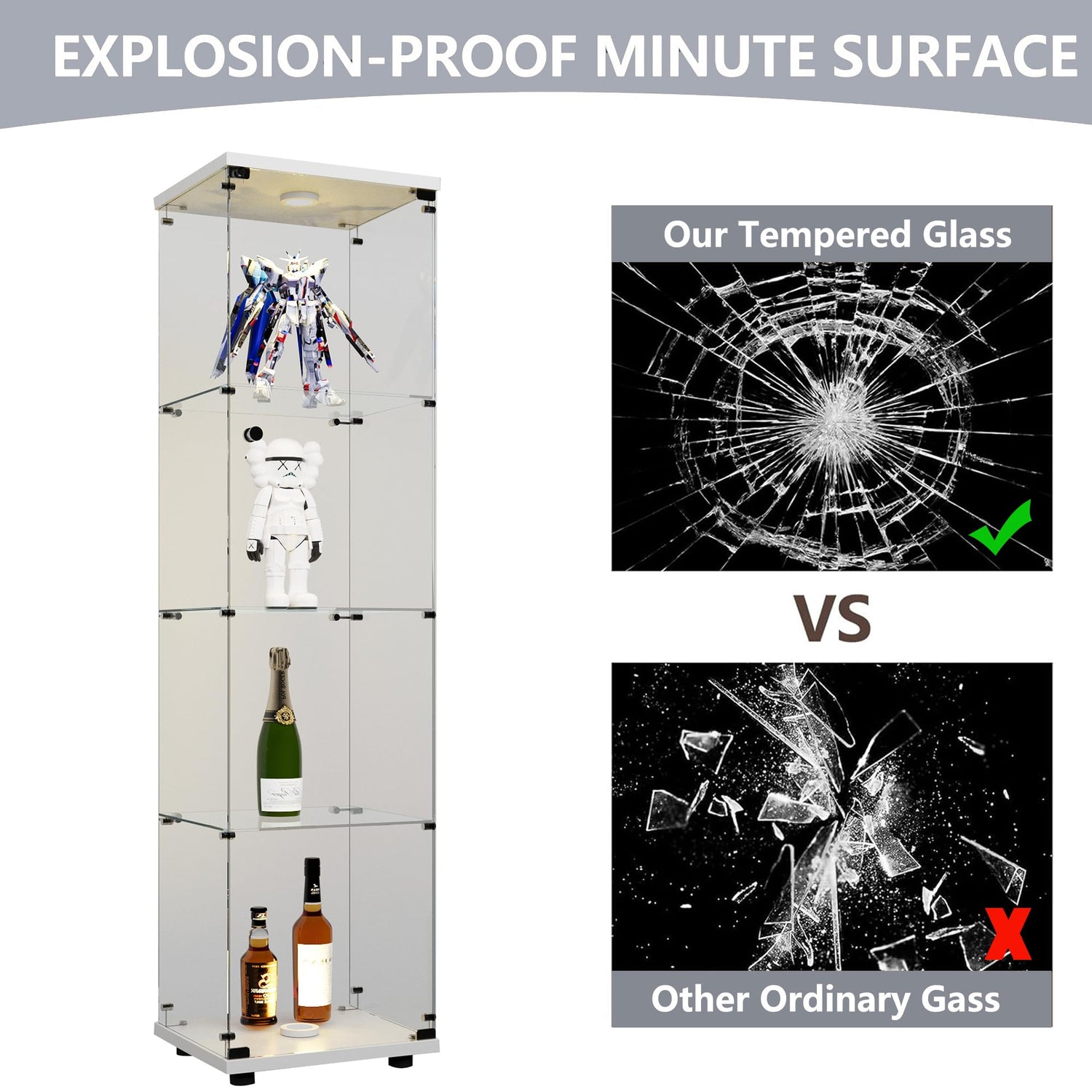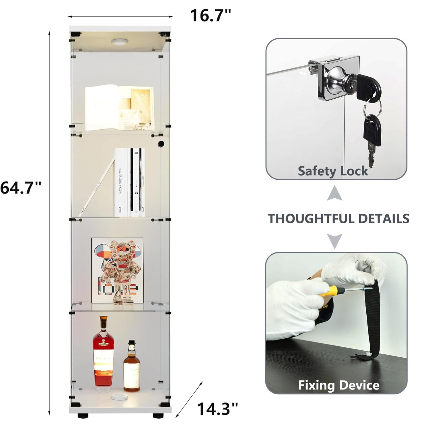 • 4 Tier Glass Display Cabinet: Glass Display Cabinet: Size 64.7"(H) x 16.7"(L) x 14.3"(W) inches, each tempered glass is 4mm thick. 4-shelf design is sturdy and stylish to display photos, books, action figures, wine and whisky; glass door is easy to open and close.