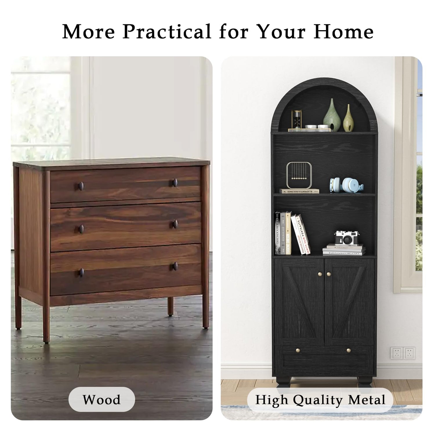 • Sturdy Construction with Black Drawer for Extra Storage:Built with durability in mind, this tall bookshelf includes a black drawer at the bottom for additional hidden storage. Whether you need a spot for books or personal items, the arched bookshelf combines form and function to keep your space neat and organized.