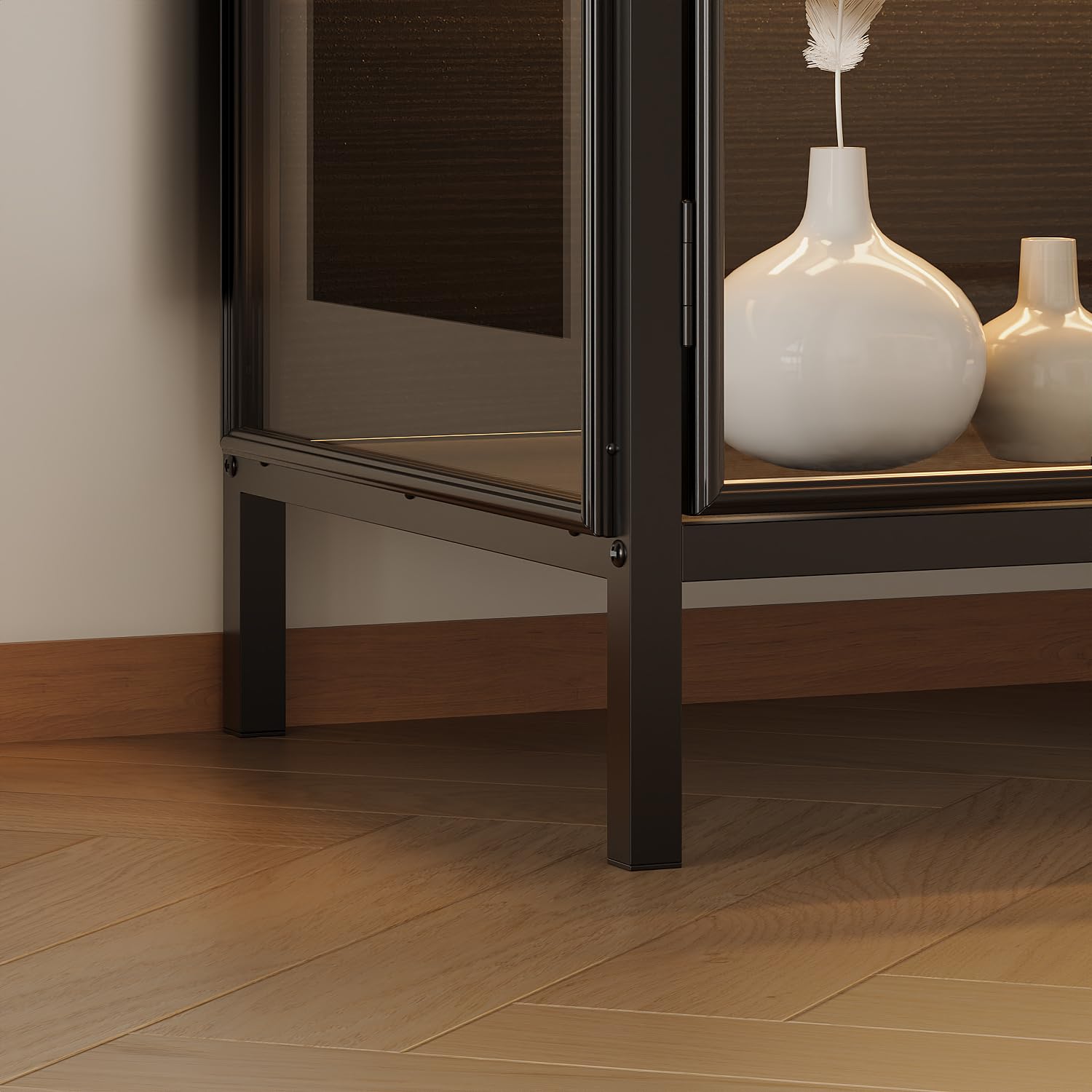 • [Glass Doors & Shelves] HOMSETTIE curio cabinet with transparent glass doors and glass shelves create an unobstructed view of your collections. The high definition glass will display your collections prettily and add value. The black metal frame and the wood grain top make this cabinet elegant