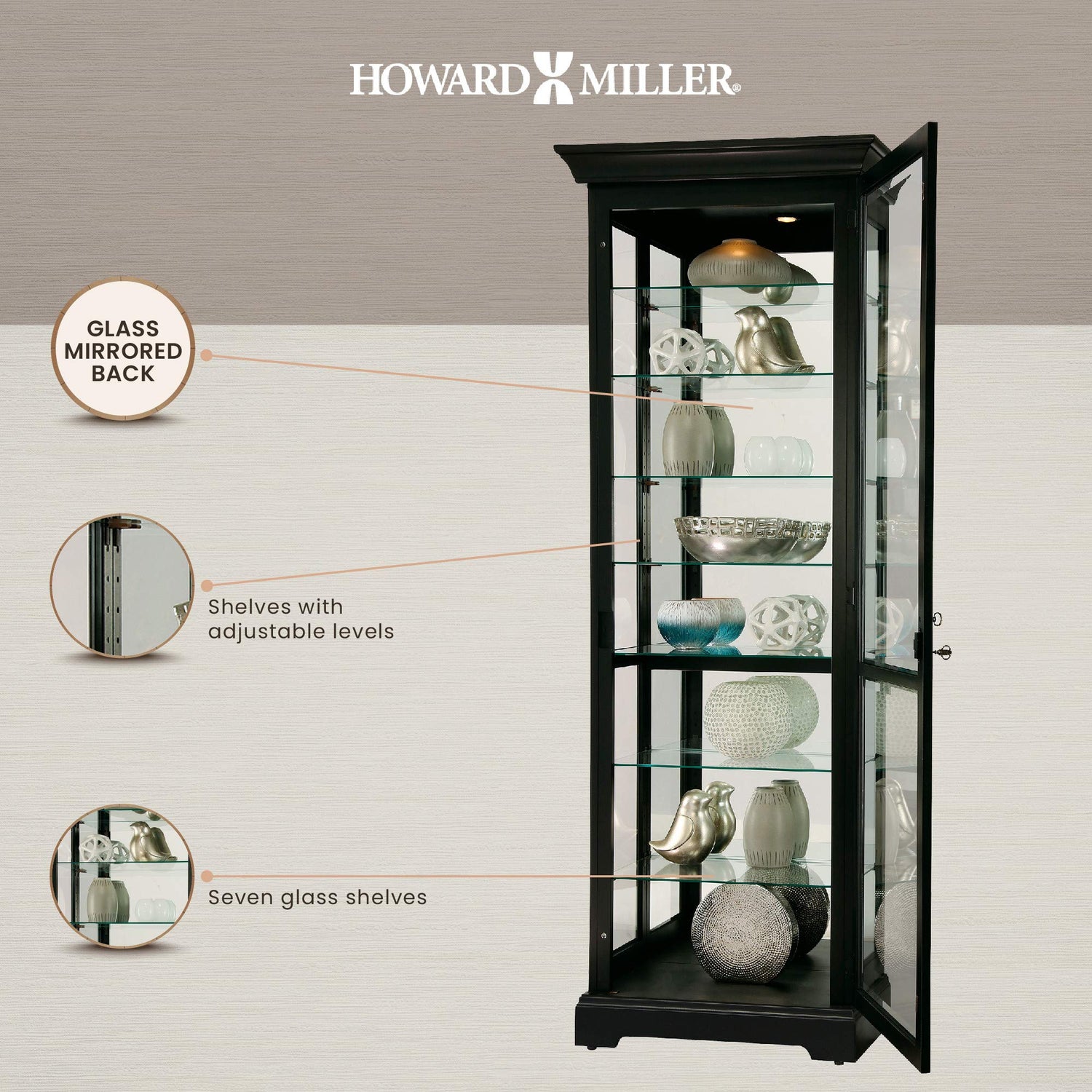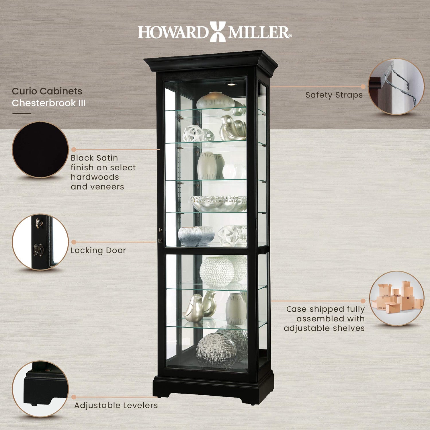 Details: The Chesterbrook III Curio Cabinet by Howard Miller has a Black Satin finish. Beveled glass. Locking front door. No Reach Touch-Lite with four levels. Plate grooves. Seven adjustable shelves, eight levels of display. Pad-Lock metal shelf clips. Adjustable floor levelers. Made in the USA.