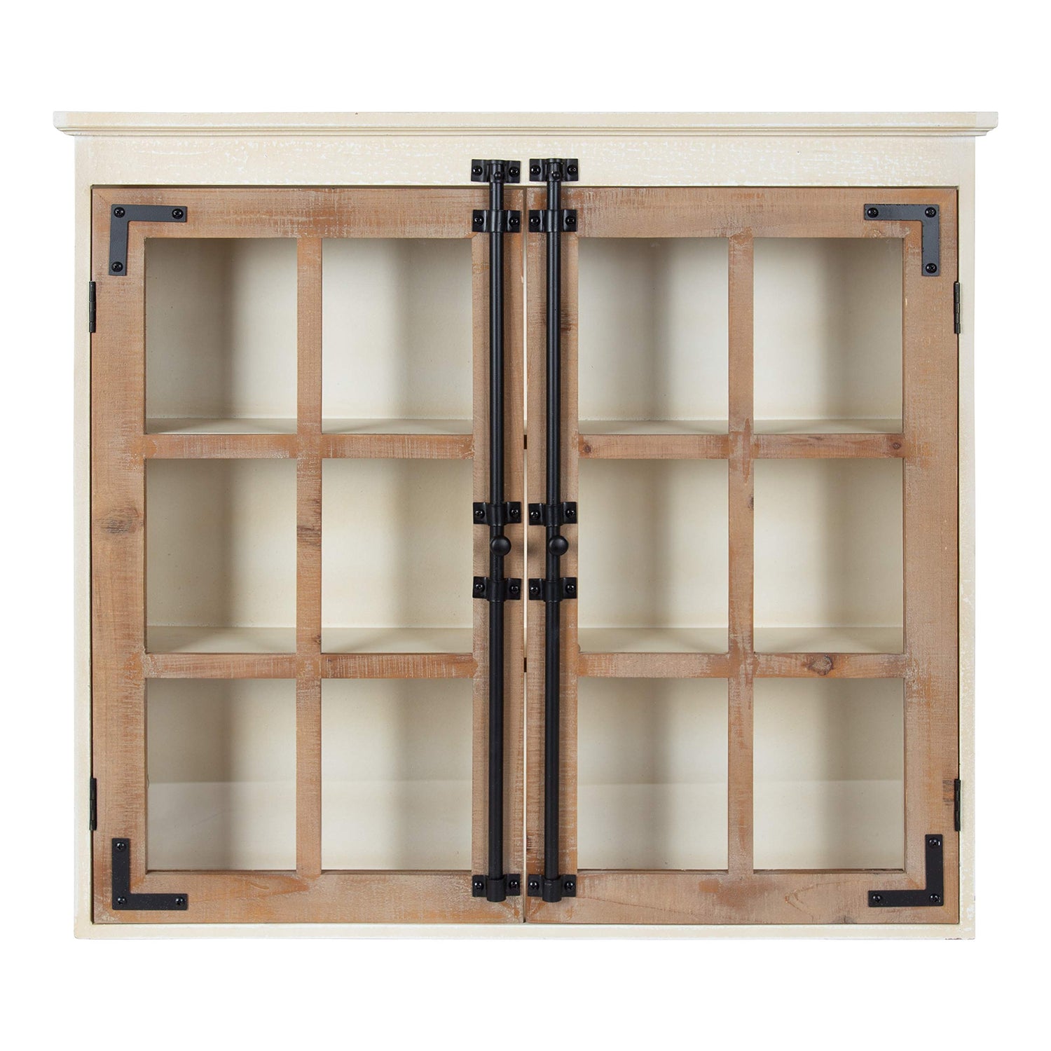 Details: Decorate your home in vintage farmhouse style using this unique hanging wall shelf with two beautiful glass windowpane doors. This hanging cabinet will organize spaces if you only have a bit of wall space but still want smart storage and great looks. It'll work exceptionally well in an entryway, mudroom, kitchen, bathroom, living room, or guest room. The two windowpane doors open with a vintage hardware-inspired design, forged in metal for the ultimate chic statement. It provides you plenty of space to store small lotions, soaps, spices, mugs, bathroom necessities, or small decorative accents. The outer dimensions of this wall shelving unit are 30 inches tall, 27.5 inches wide, and 6.5 inches deep. Two metal z-brackets are installed on the back of the cabinet for easy, sturdy wall display. This wall cabinet arrives completely assembled and ready to use.