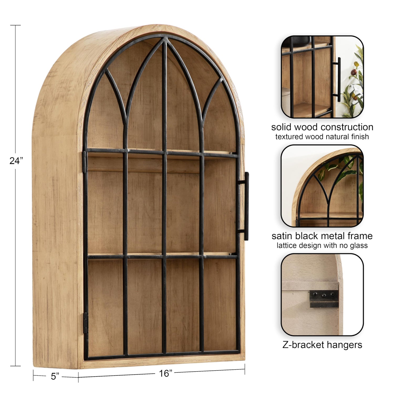 The Kate and Laurel Megara wall cabinet would add a beautiful vintage farmhouse touch to your home decor. Perfect to showcase any of your favorite collectibles or to use as a bonus arched cabinet for open storage in your entryway, bathroom or bedroom. The inside has three sectioned shelves for plenty of storage space for everyday essentials or decorative accents. This storage cabinet features an endearing arched design that combines curvature and loads of open storage. The natural wood background adds to the lovely display area. The black iron metal door has a classic decorative design and latches with a hidden magnetic clasp, making for an elegant appearance. The installed Z-brackets on the back of the cabinet allow for sturdy and simple wall hanging. The overall dimensions of this curio cabinet are 16 inches wide by 5 inches deep by 24 inches tall.