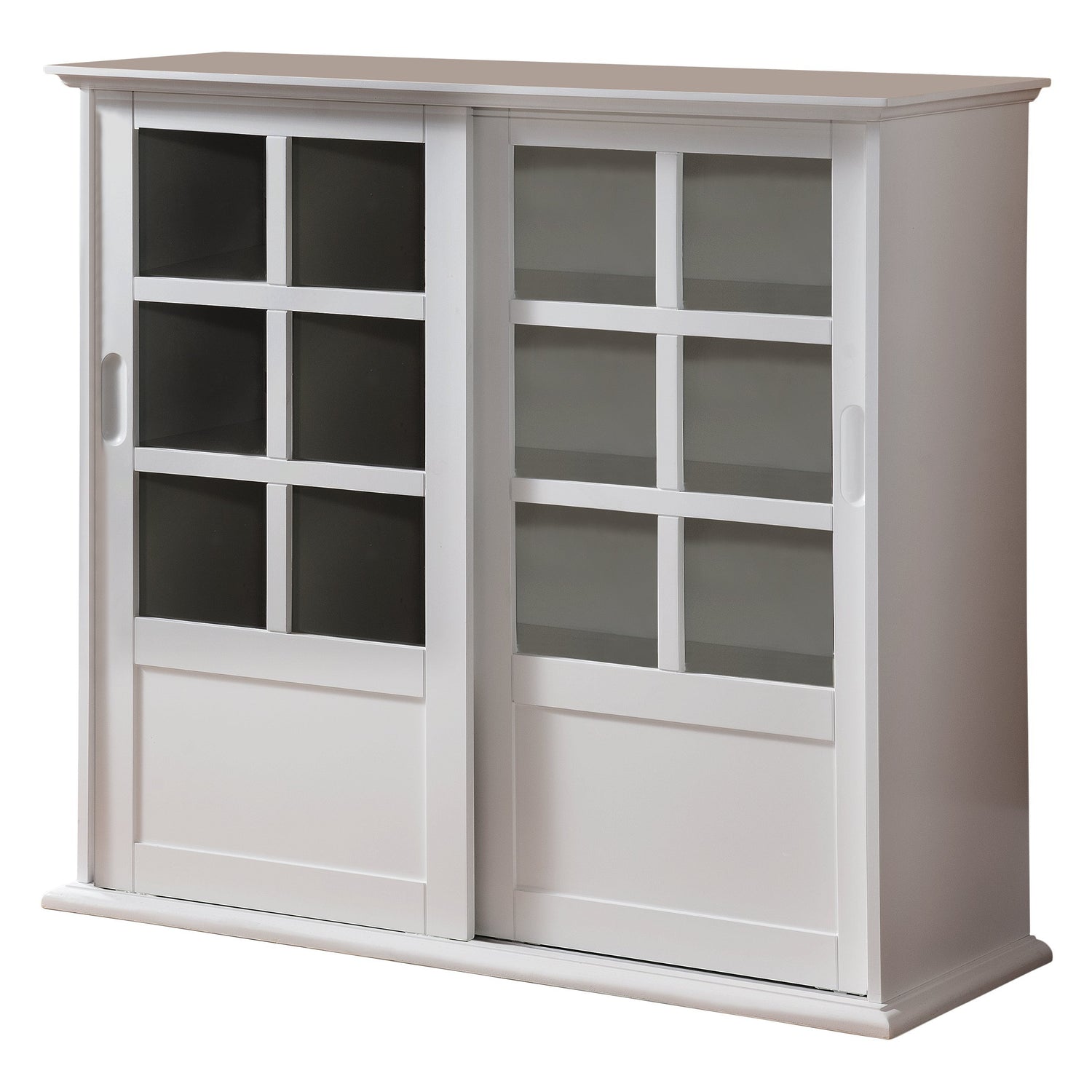 - Two sliding glass doors with simple latticework overlays open to reveal three shelves with plenty of storage space for displaying rows of your favorite reads, mementos collected on fondly remembered vacations, and framed photos of families and friends.
