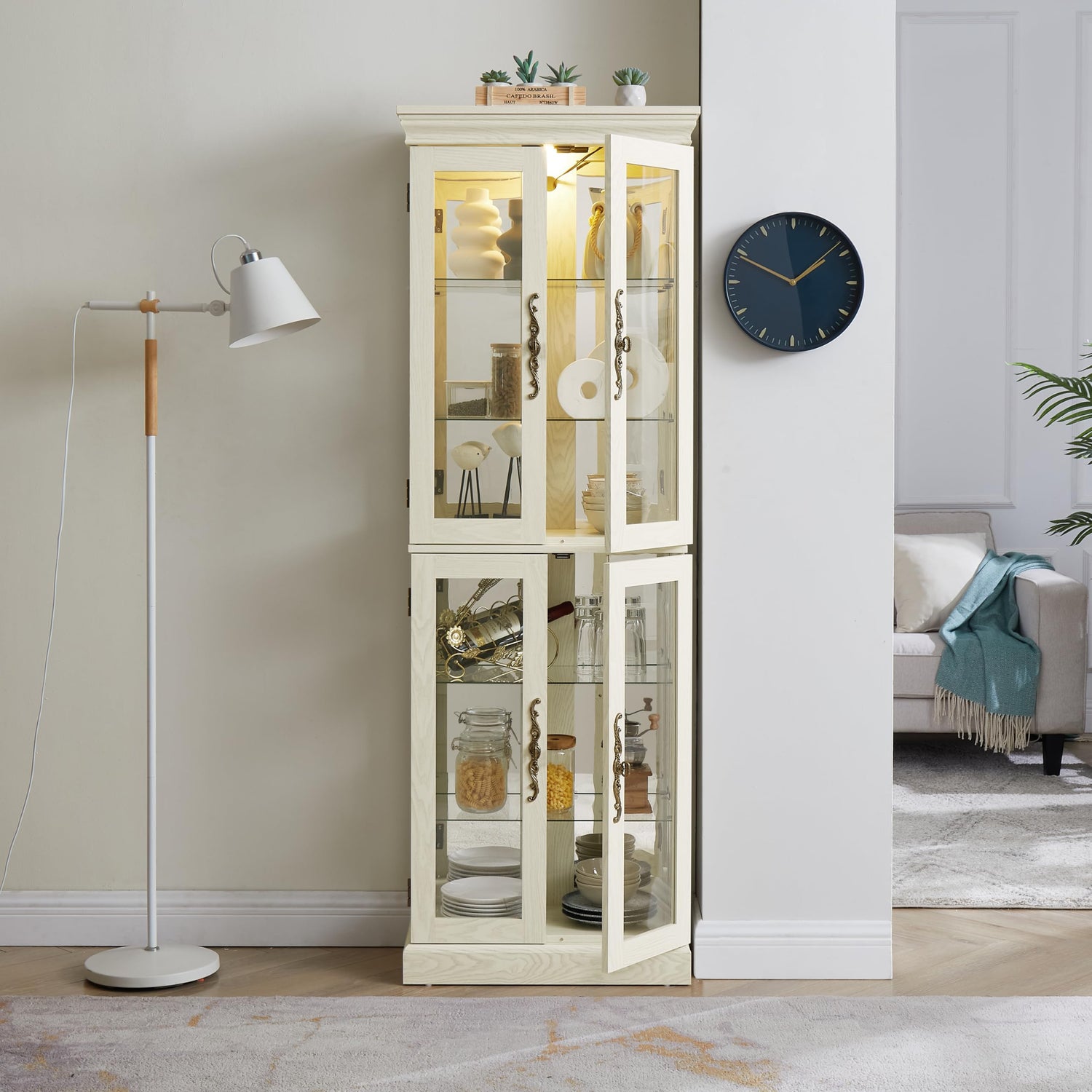 • Curio Cabinet with Adjustable Shelves: The size of the display cabinet is 71.26"H x 24.21"W x 12.2"D, 6 shelves, 4 are tempered glass shelves that can be adjusted, and each shelf can hold up to 25 lbs.Adjust the curio cabinet shelf to accommodate collections of all sizes.The 4 front hinged doors make it easy to rearrange, clean and organize the contents in the curio cabinet. Magnetic hardware keeps the doors securely closed in place