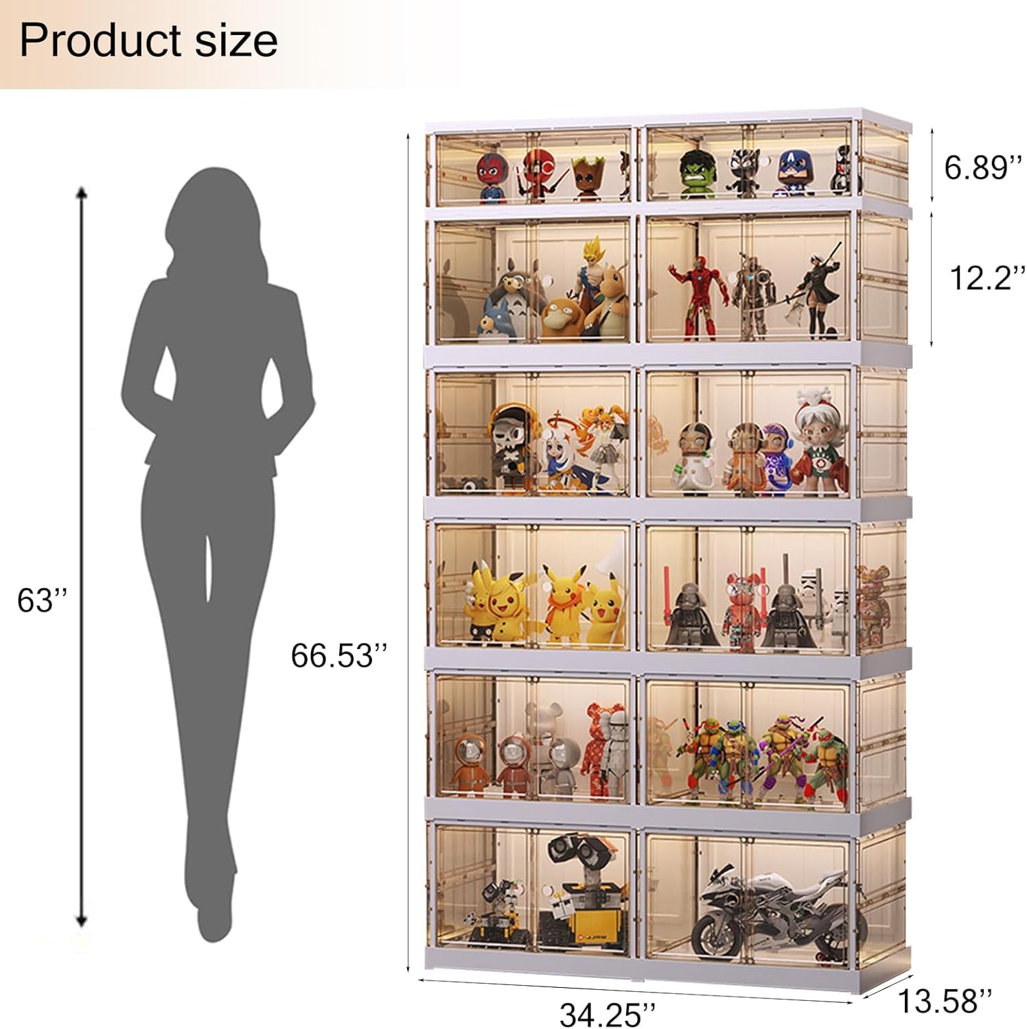 • 【Large capacity】Our display case has six shelves, measuring 66.53 inches (height) x 34.25 inches (length) x 12.2 inches (width), providing ample room to store and exhibit a variety of items such as hands, toys, ornaments, and more.