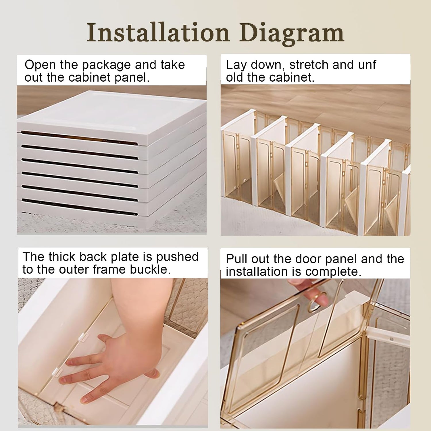 • 【Foldable & Tool-Less Installation】The storage cabinet with Doors is a new storage organizer with a foldable design that can be folded away on all sides when not in use, transforming the storage cube into a flat panel for easy storage under the bed or trunk. When need to use it, you don't need tools, just continue with a few manual steps to complete the installation.