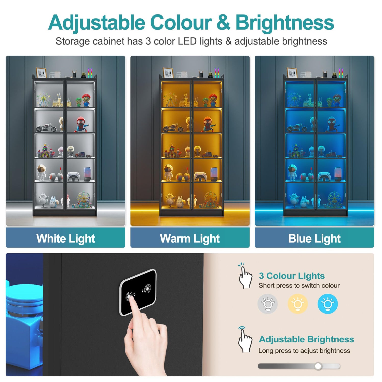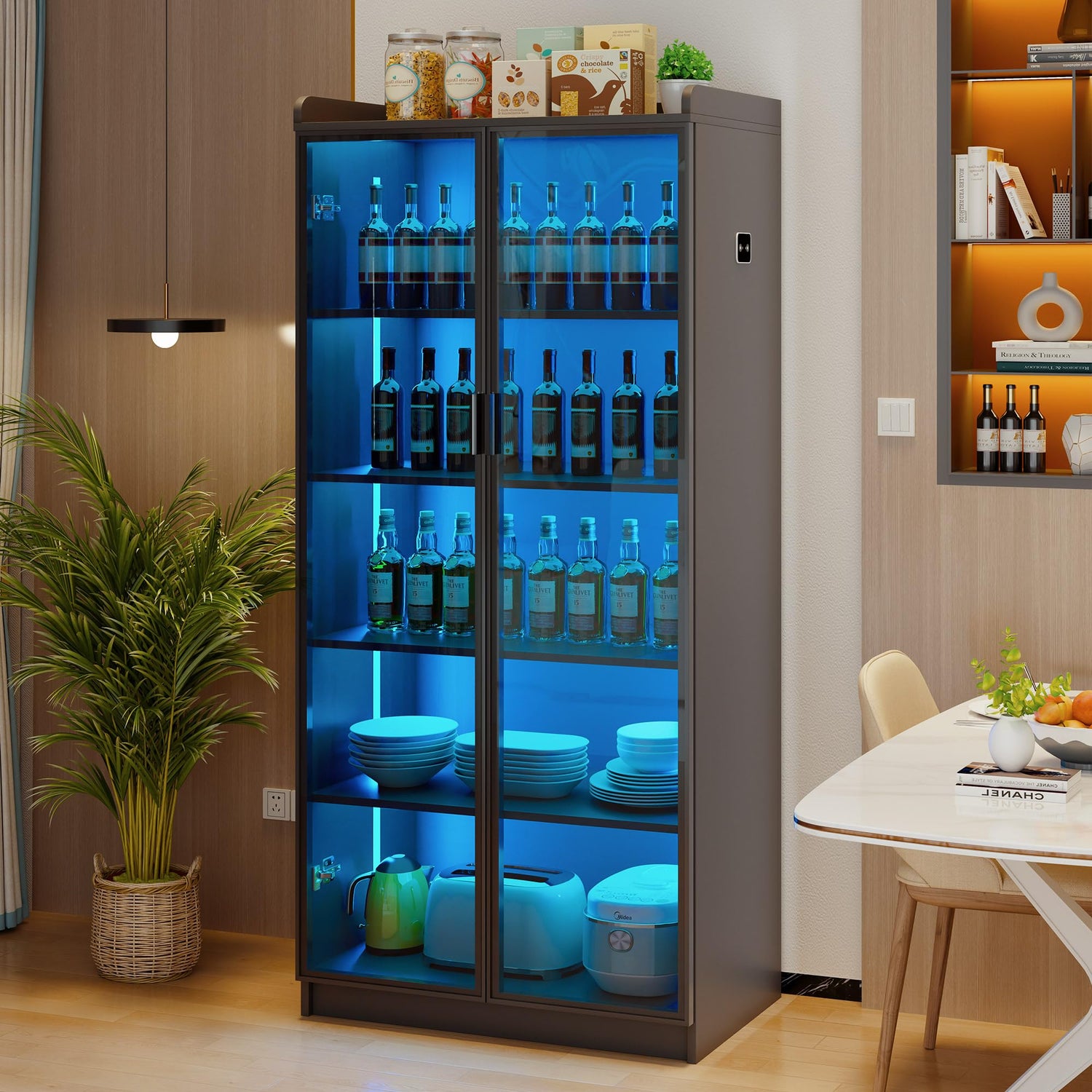 Lvifur Tall Storage Cabinet up to 70", LED Living Room Curio Cabinet with Human Body Induction, 5 Tier Bookcase Display Cabinet with Adjustable Shelves for Office (Black)