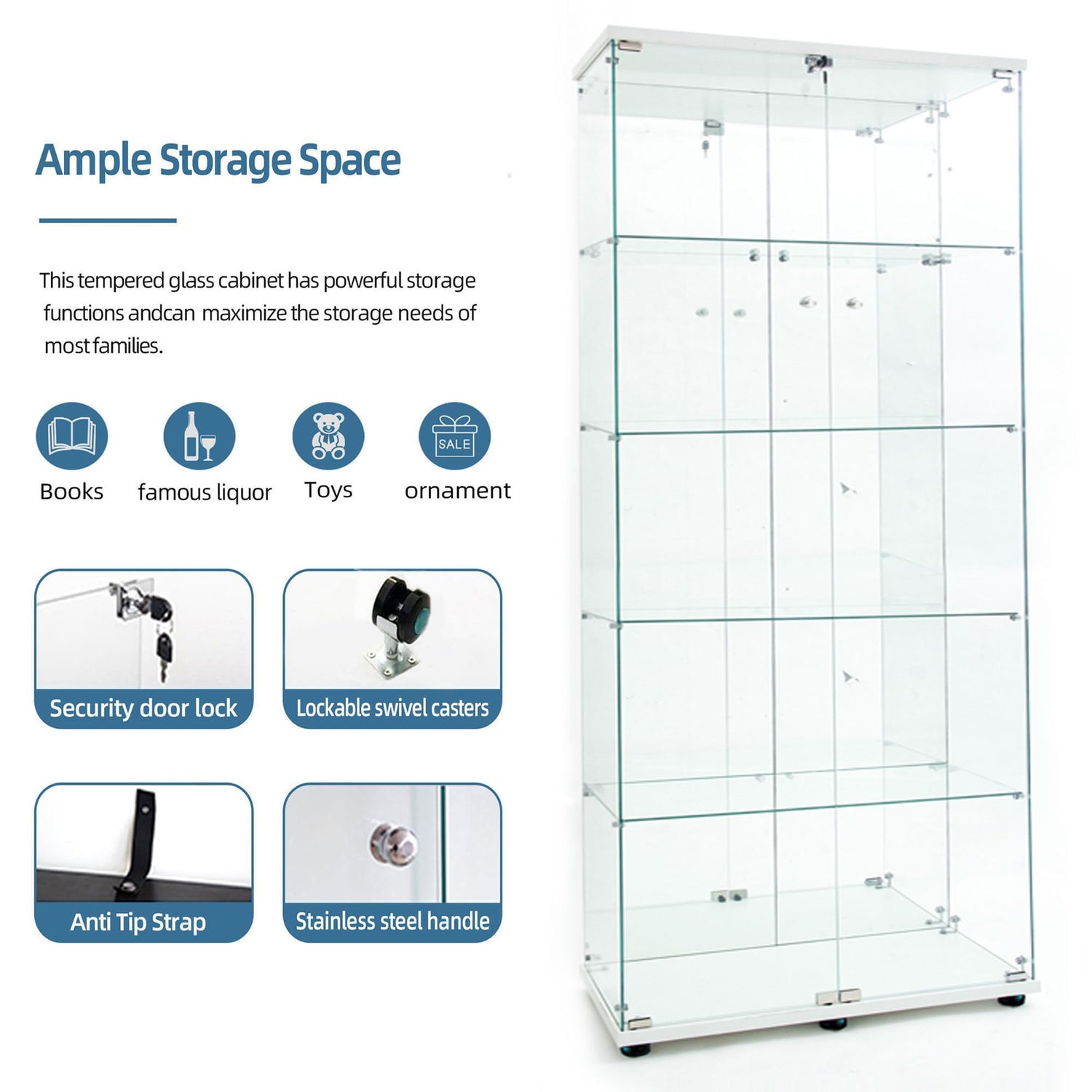 • 【Lighted Glass Display Cabinet】Measuring 76.18" (H) x 30.91" (L) x 13.58" (W), this tempered glass cabinet offers ample space for displaying your collectibles, decor, or valuables. With an overall weight capacity of 110 lbs and each tempered glass shelf supporting up to 11lbs, it combines functionality with durability.