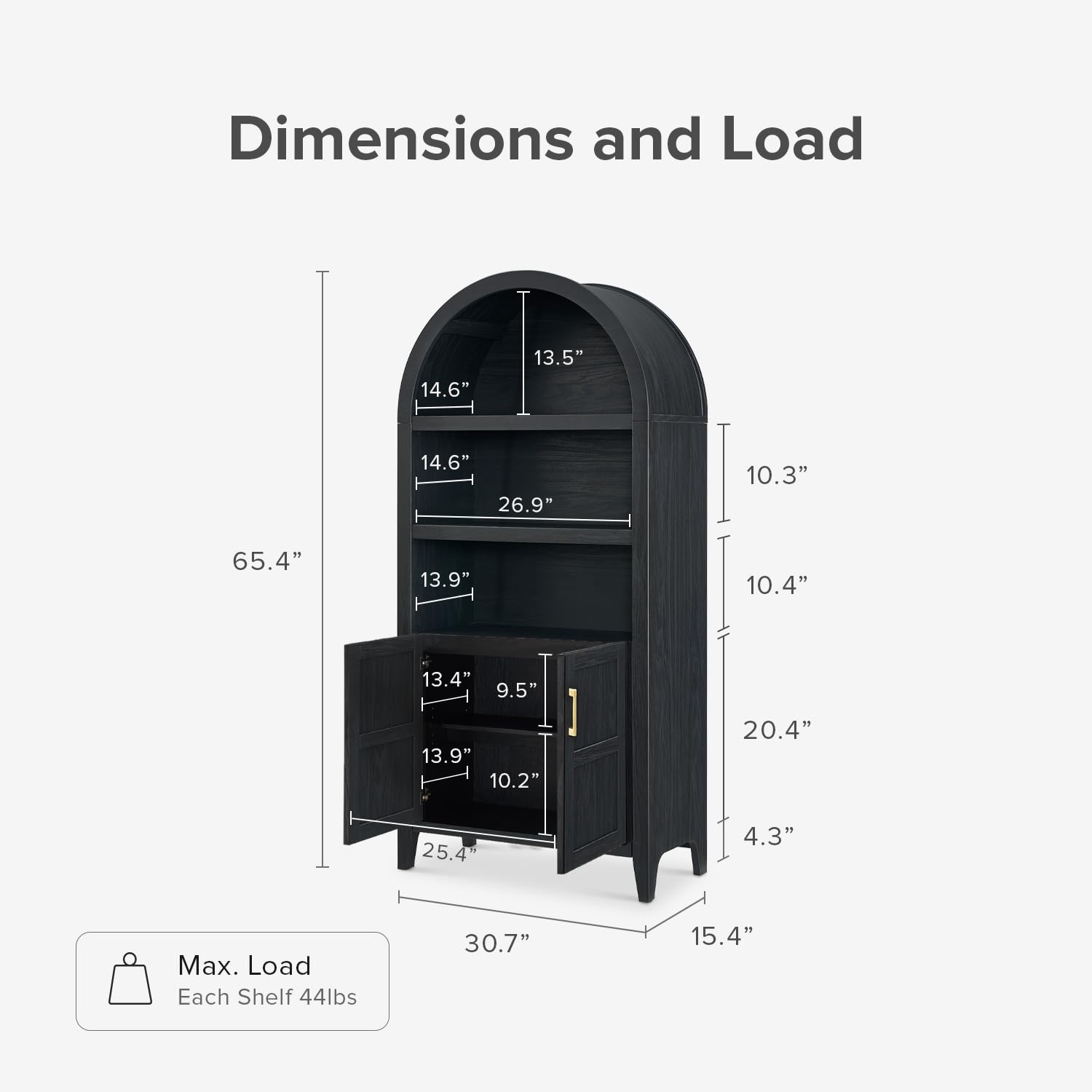 mopio Lauren 65.4" Short Arched Cabinet, 5-Tier Arched Bookcase with Doors and Shelves, Mini Arched Bookshelf with Storage, Kitchen Pantry Cabinet, Wooden Storage Cabinet for Living Room (Black)