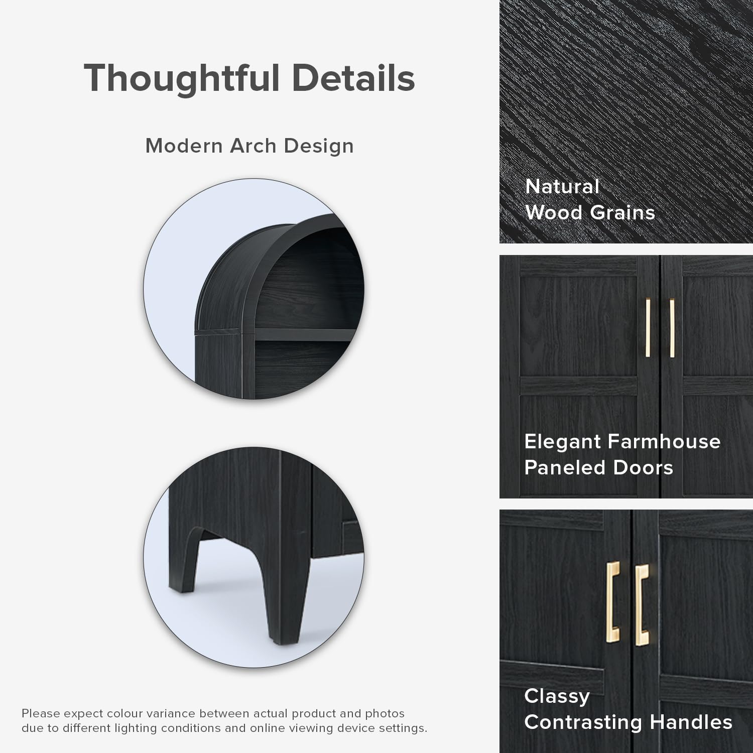 - Unique design: Boasting a unique arched design, farmhouse paneled frame design, soft-closing doors and classy contrasting handles, it is meticulously crafted with particle board and enveloped in a high-quality laminate. This ensures durability and showcases an enchanting wood grain design pattern, imparting a soft and inviting look to your space